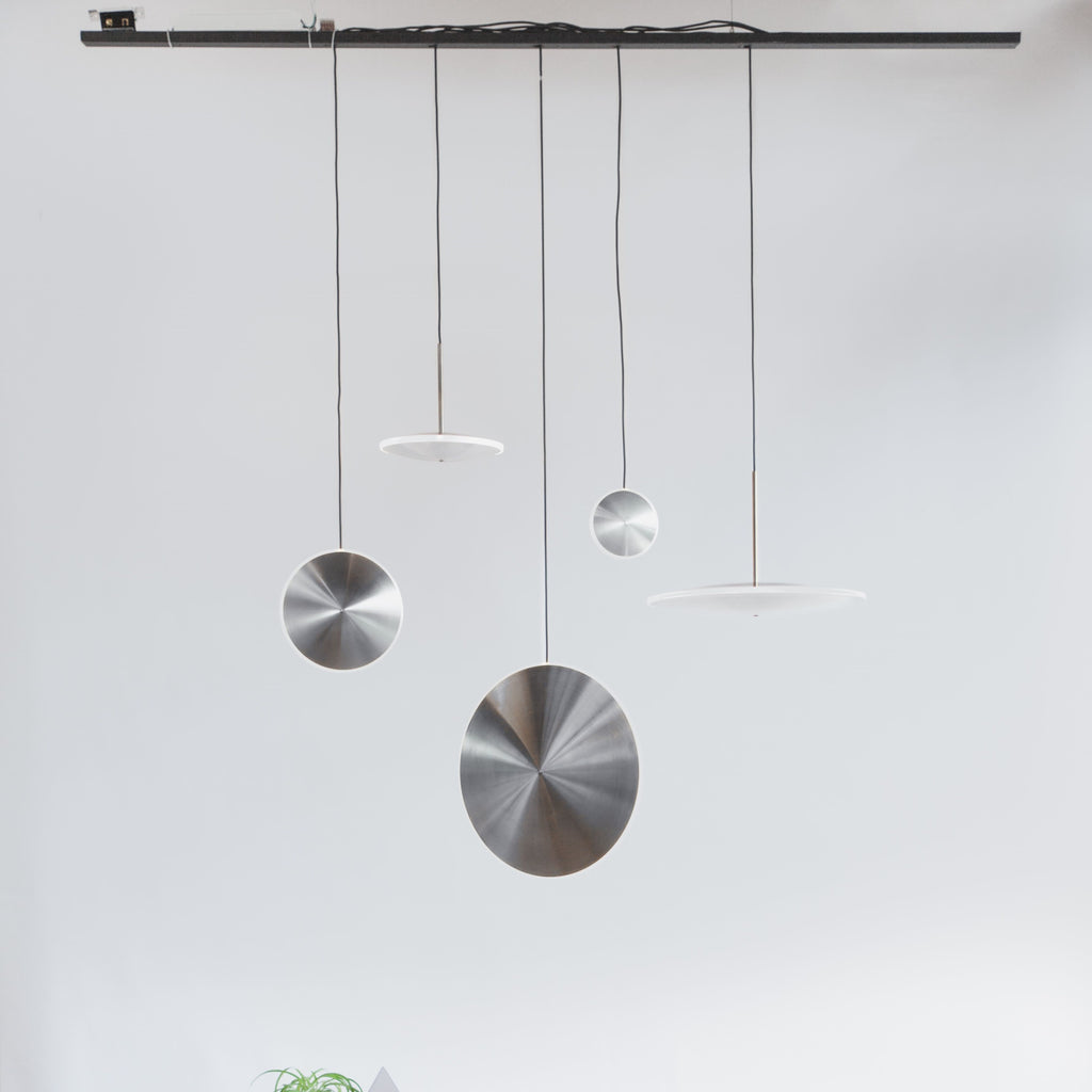 Mimicking the phosphorescent envelope found around stars, Chrona lights create a luminous glow by combining spun brass and diffused acrylic. With a variety of configurations in both horizontal and vertical orientations, Dish pendants can be clustered together to make stunning constellations or individually hung to accentuate any space. Thin, yet robust, the pendants are available in diameters ranging from 6 to 17 inches (14-42cm).