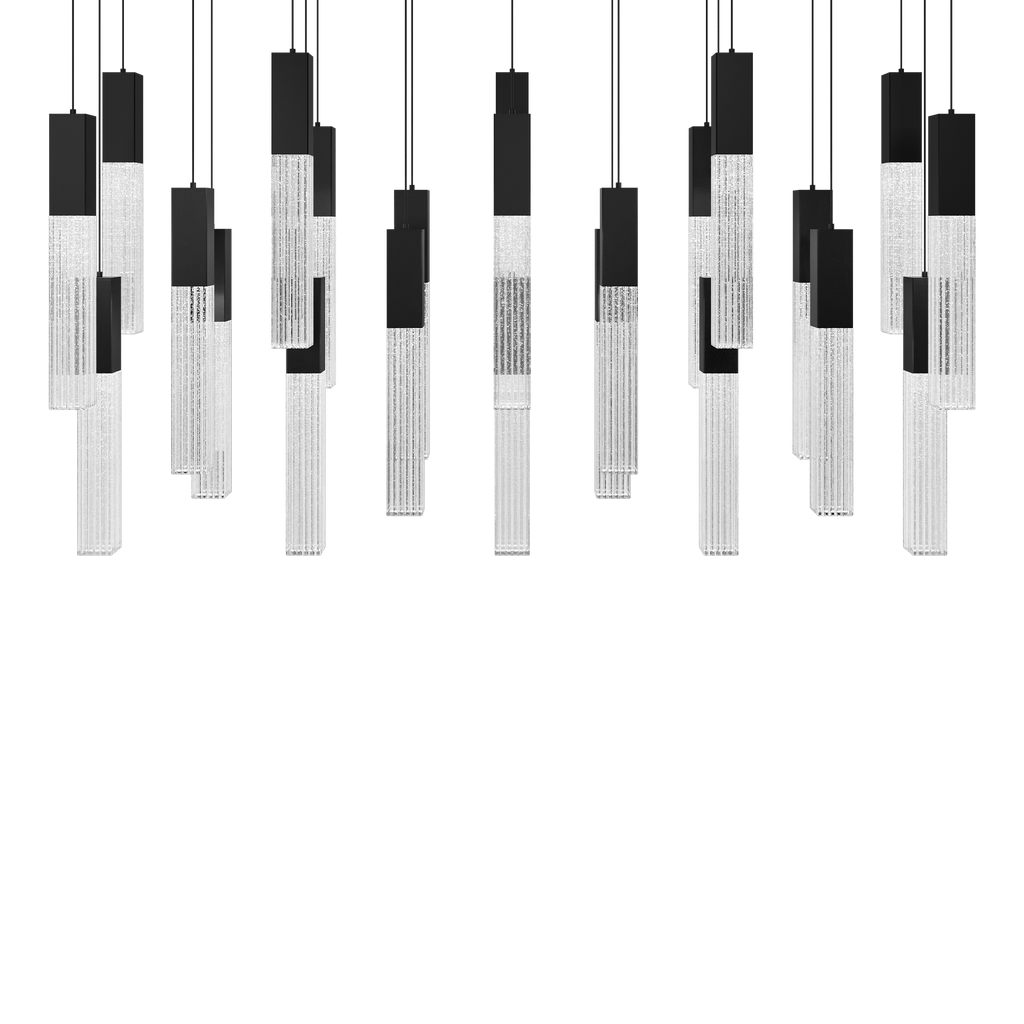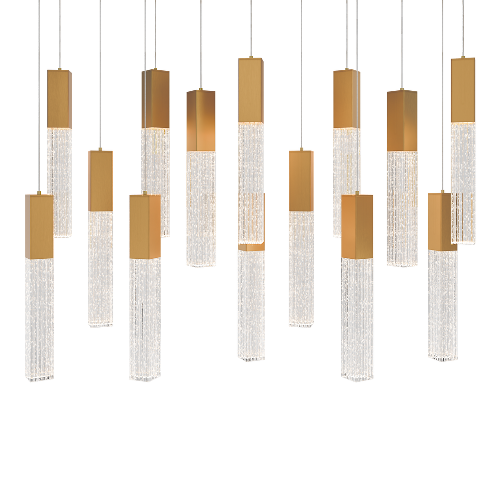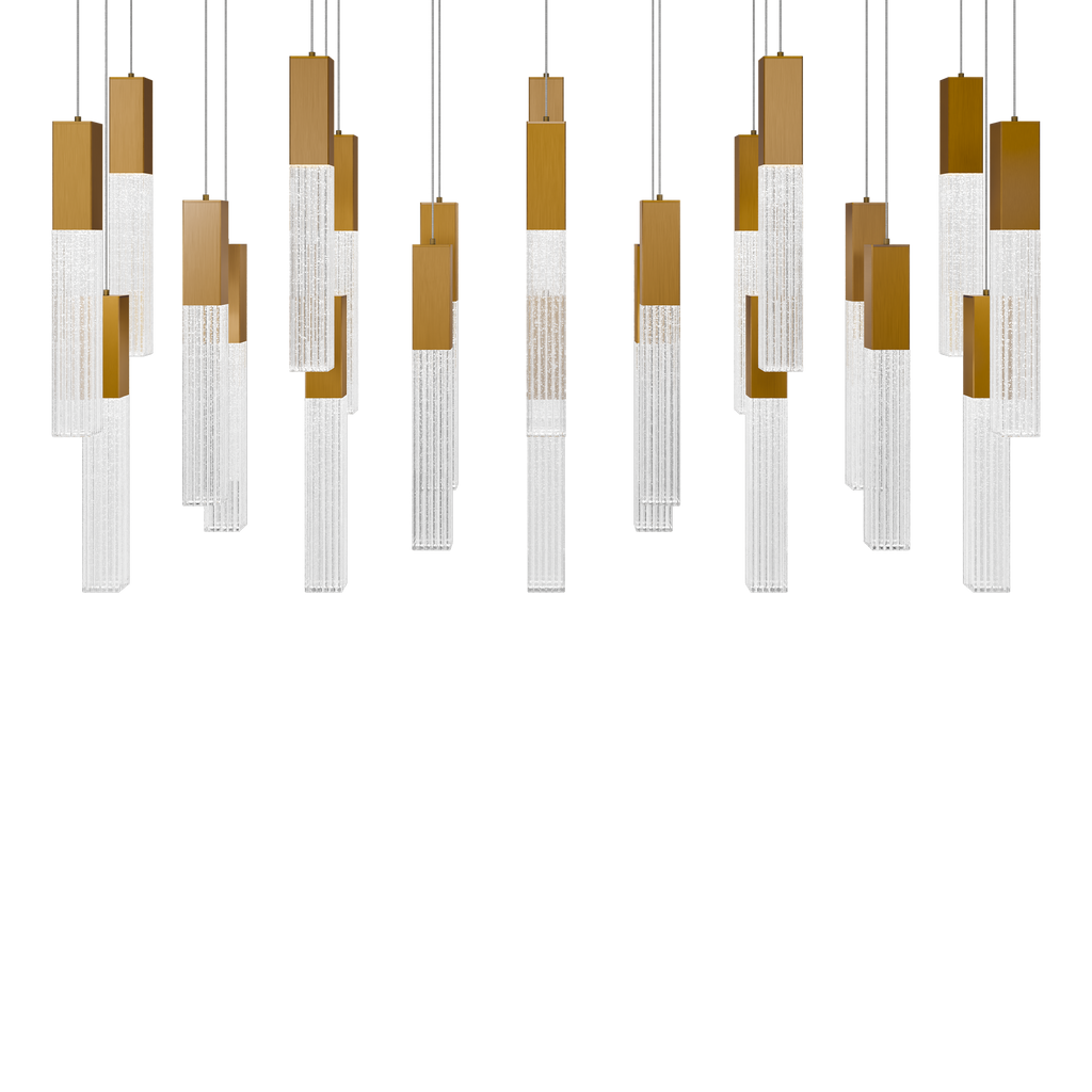 In a luxe finish, the Cinema linear multi-light pendant makes a modern statement that’s right in line with the latest trends. Painstakingly V-cut seeded crystal adds understated glamour when it fills with light sourced from high-performance LEDS offering color temperature adjustability. Available in an aged brass or black finish, you can select 14 or 23 lights installed on a linear canopy.