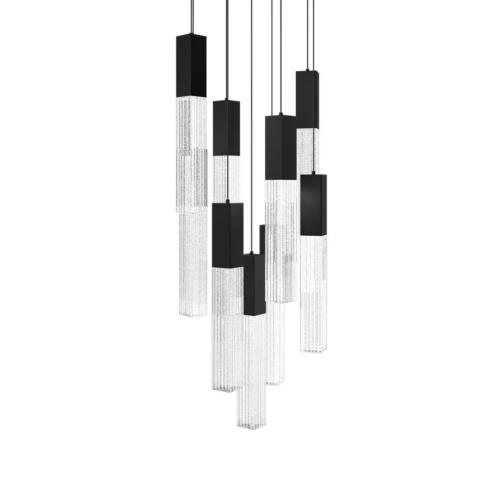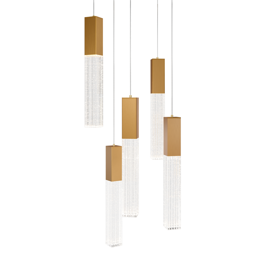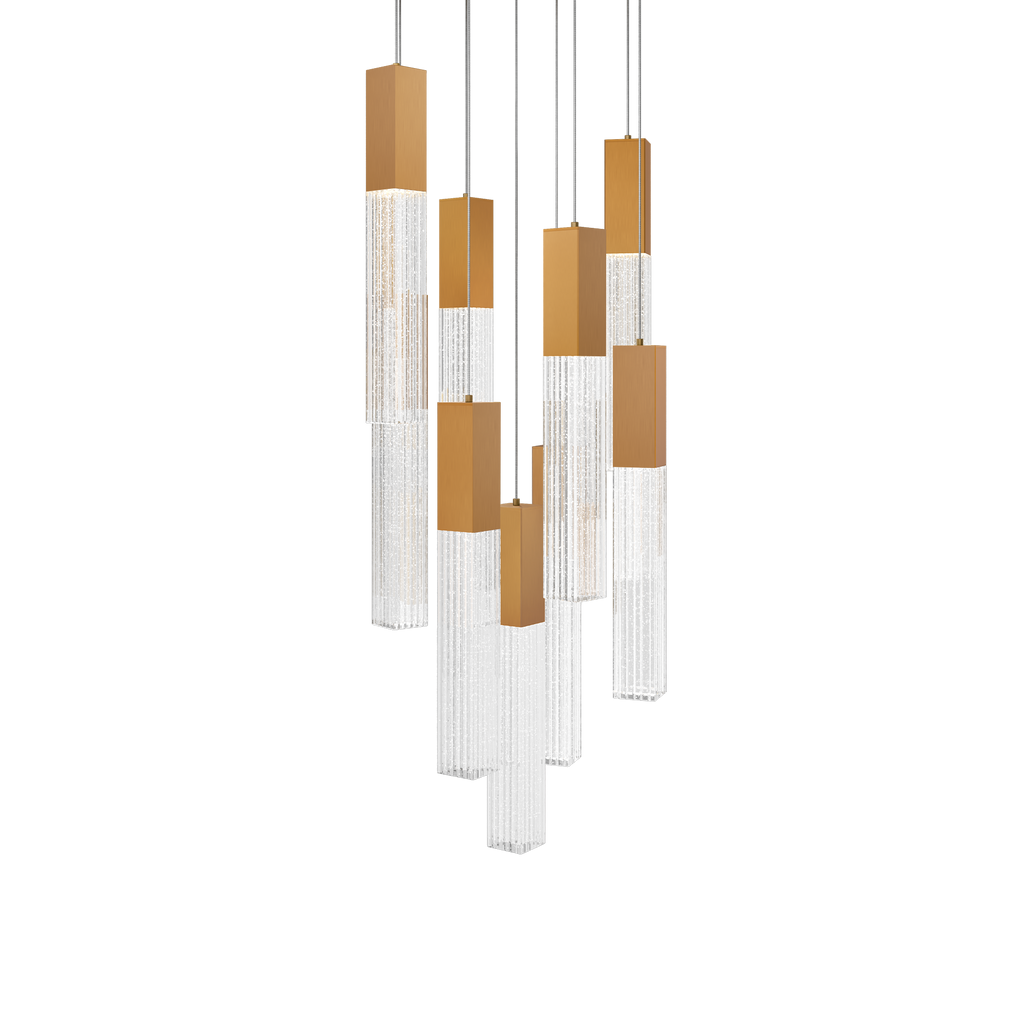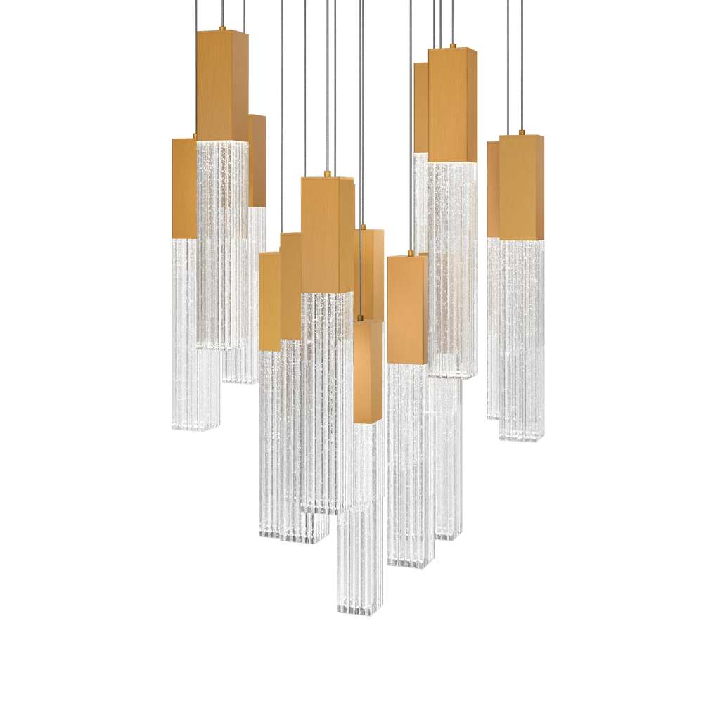 In a luxe finish, the Cinema round multi-light pendant makes a modern statement that’s right in line with the latest trends. Painstakingly V-cut seeded crystal adds understated glamour when it fills with light sourced from high-performance LEDS offering color temperature adjustability. Available in an aged brass or black finish, you can select 3, 5, 9, 15 or 21 lights installed on a round canopy.