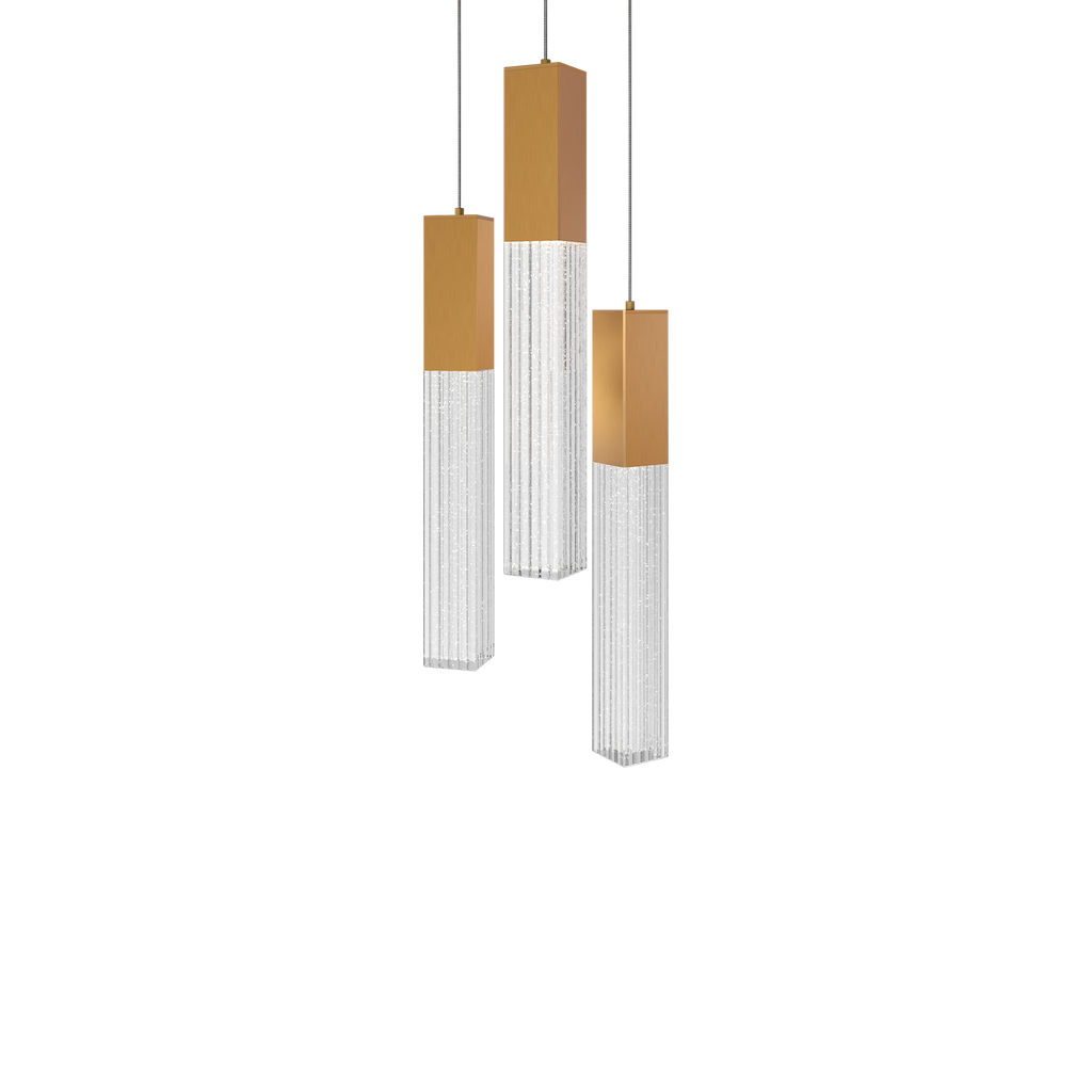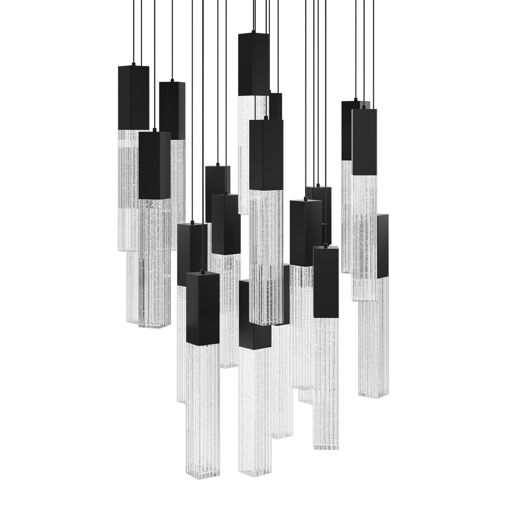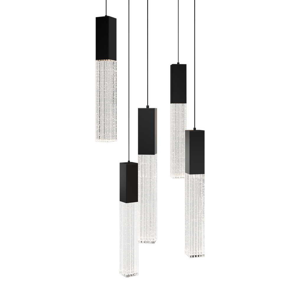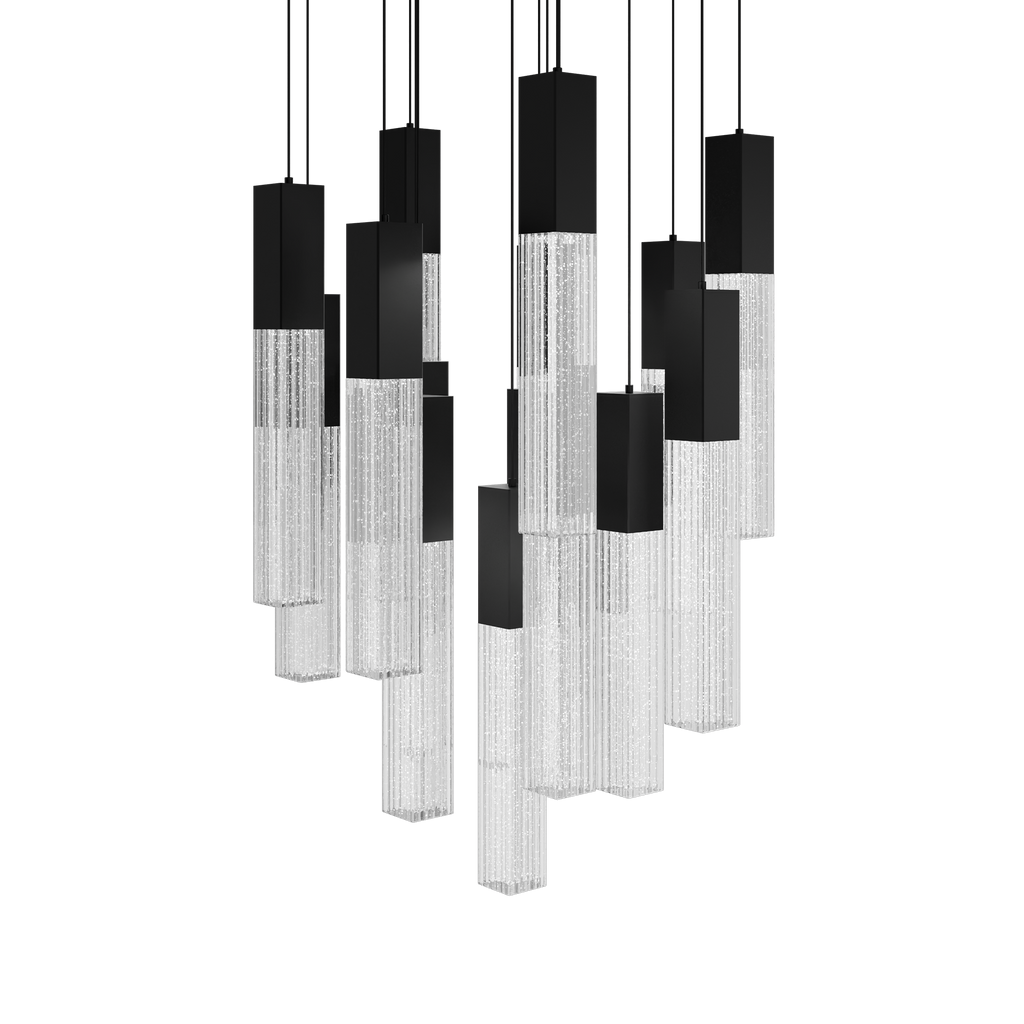 In a luxe finish, the Cinema round multi-light pendant makes a modern statement that’s right in line with the latest trends. Painstakingly V-cut seeded crystal adds understated glamour when it fills with light sourced from high-performance LEDS offering color temperature adjustability. Available in an aged brass or black finish, you can select 3, 5, 9, 15 or 21 lights installed on a round canopy.
