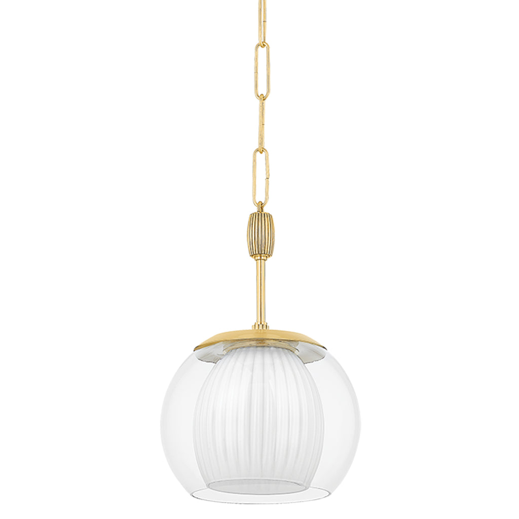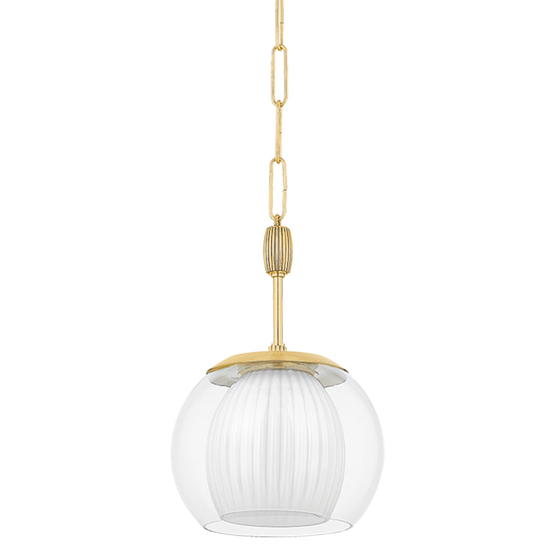 Inspired by nature, the retro silhouette of Clementon features a single orb accented by graceful details. The exterior shade is molded from clear glass, while the opal shiny glass interior features elegant fluting. Finished in Aged Brass, Clementon can make a fresh statement alone or be grouped above a countertop.