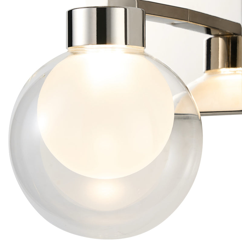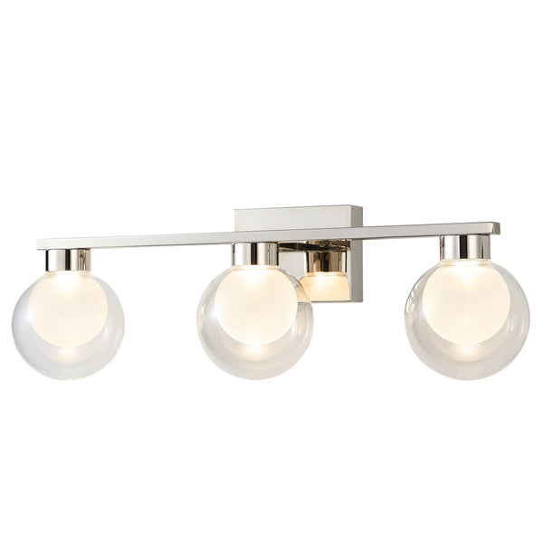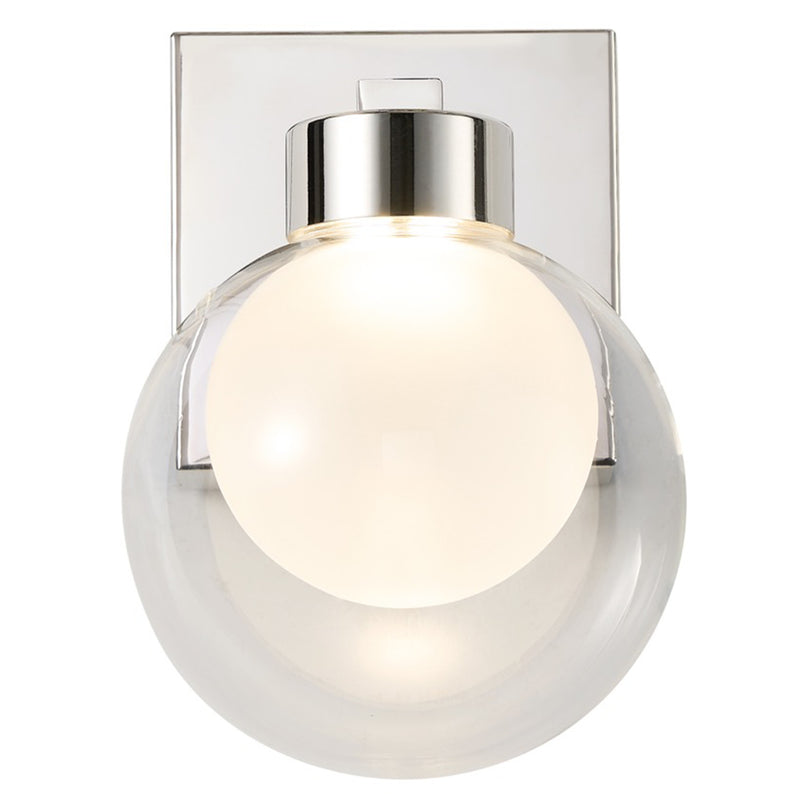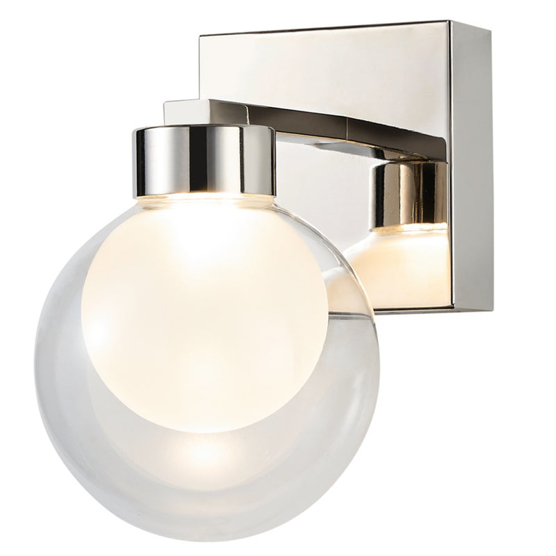 The Colton collection wall sconce exudes contemporary elegance with its polished nickel frame, radiating refined charm. Its double glass design—clear outer and frosted inner—creates a mesmerizing glow, enhanced by energy-efficient LED illumination. Tailored to your ambiance, a convenient 3CCT switch allows you to choose between warm (3K), neutral (4K), or cool (5K) color temperatures. Perfect for modern interiors, this fixture blends practicality and artistry effortlessly. Great for a bathroom vanity, hallway or dining room.