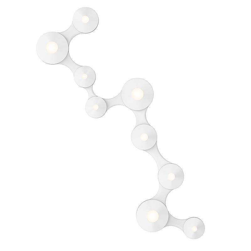 Flowing sculptural shapes connect clusters of luminaires across wall or ceiling surfaces in this organically modern system of light. Dramatically undulating patterns and paths characterize connected configurations of any size, while individually mounted three-light modules highlight the flowing forms, bringing a soft approach of artistic expression to this expandable system.