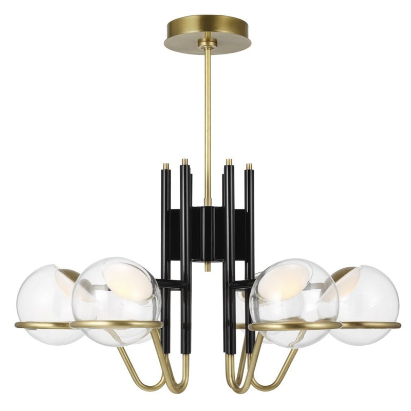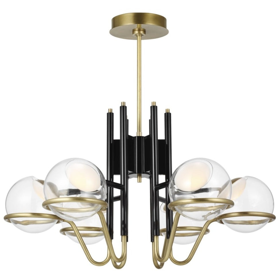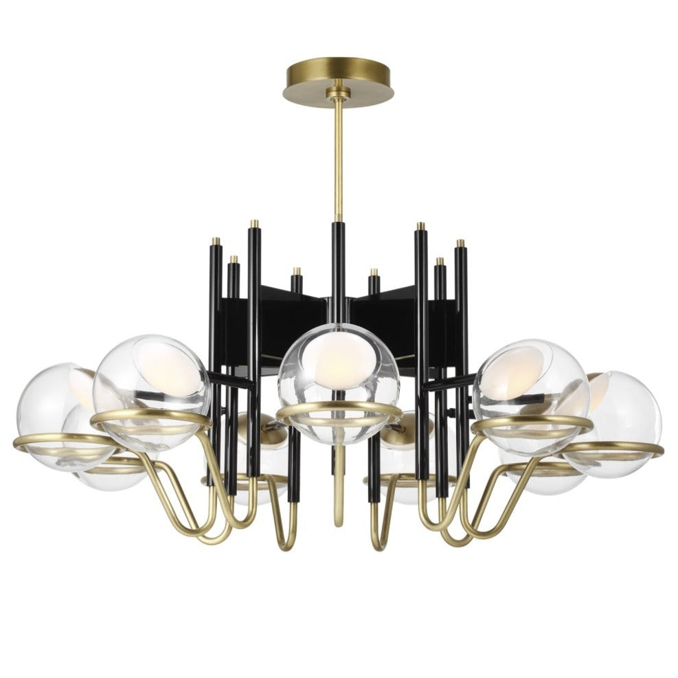The Crosby Large Chandelier by AvroKO for Tech Lighting blends the radiance of 1970's Italian flair, with a striking yet simple design. Distinctive to its musical delicacy, the glossy black metal armature yields to an elegant brass “harp” holding a glass globe dispersing light fluidly and illuminating any space with perfection.