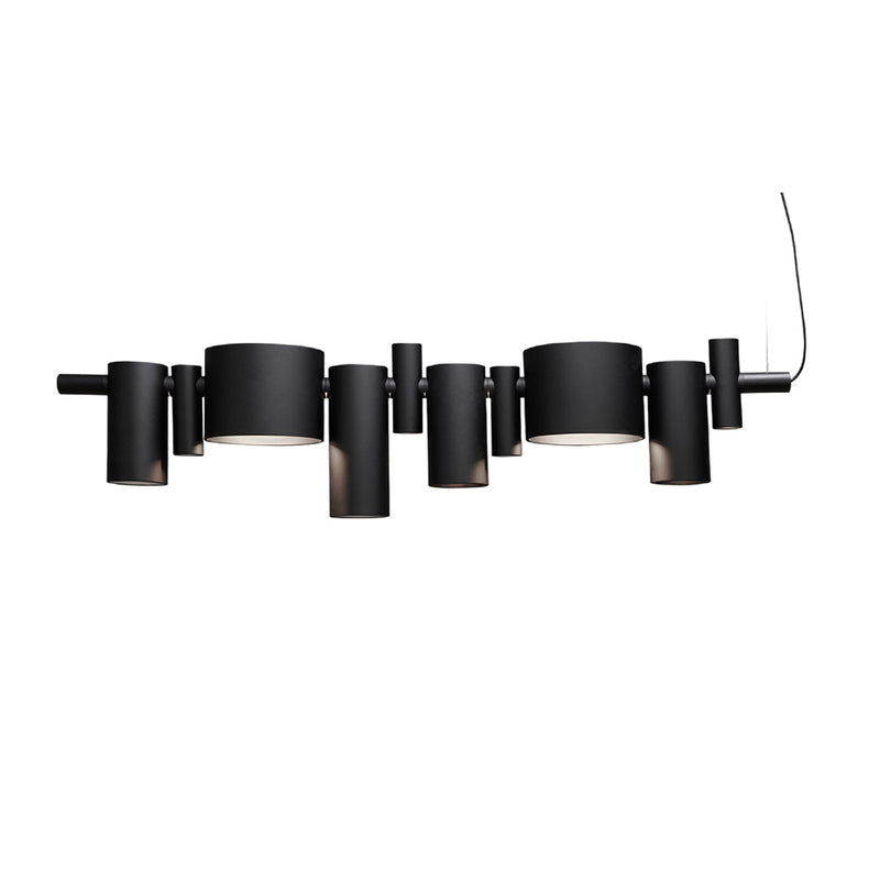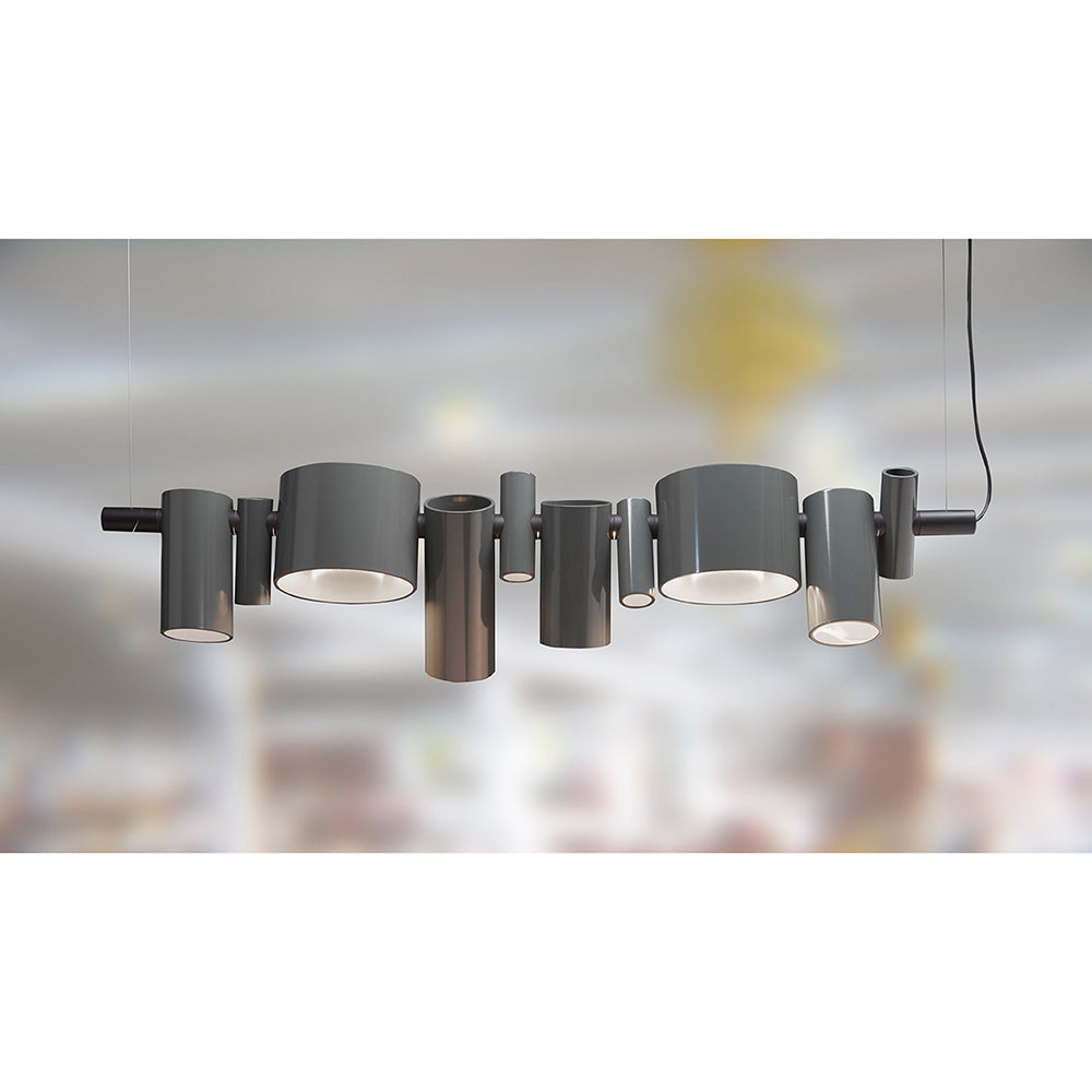 The composition’s pivotal element is a central horizontal body that encloses the LED light source and supports ten thin metal cylinders of different diameters designed as adjustable spotlights. The spotlights, usually conceived as technical components, become a decorative element in this lamp because of their irregular design in size and positioning along the central support.