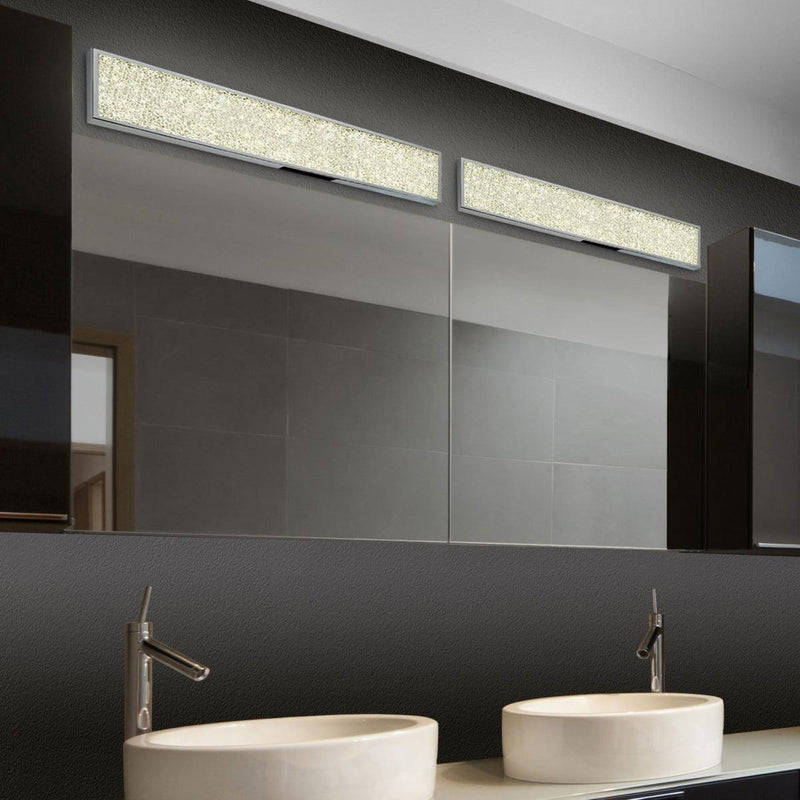 Honed to introduce a glittery update in your bathroom space, the Dazzle 18 inch LED Bath Bar by Sonneman Lighting is a luminaire worth owning. Modeled with a pleasing color scheme, this bar light puts forth a visually attractive combination of polished chrome finish enveloping the metallic frame and crushed glass gracing the front panel. The texture created by crushed glass used on the lampshade dazzles with grace when illuminated using LED bulbs. This rectangular bar light can be used in bathrooms to render an aesthetically appealing look to the décor.