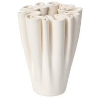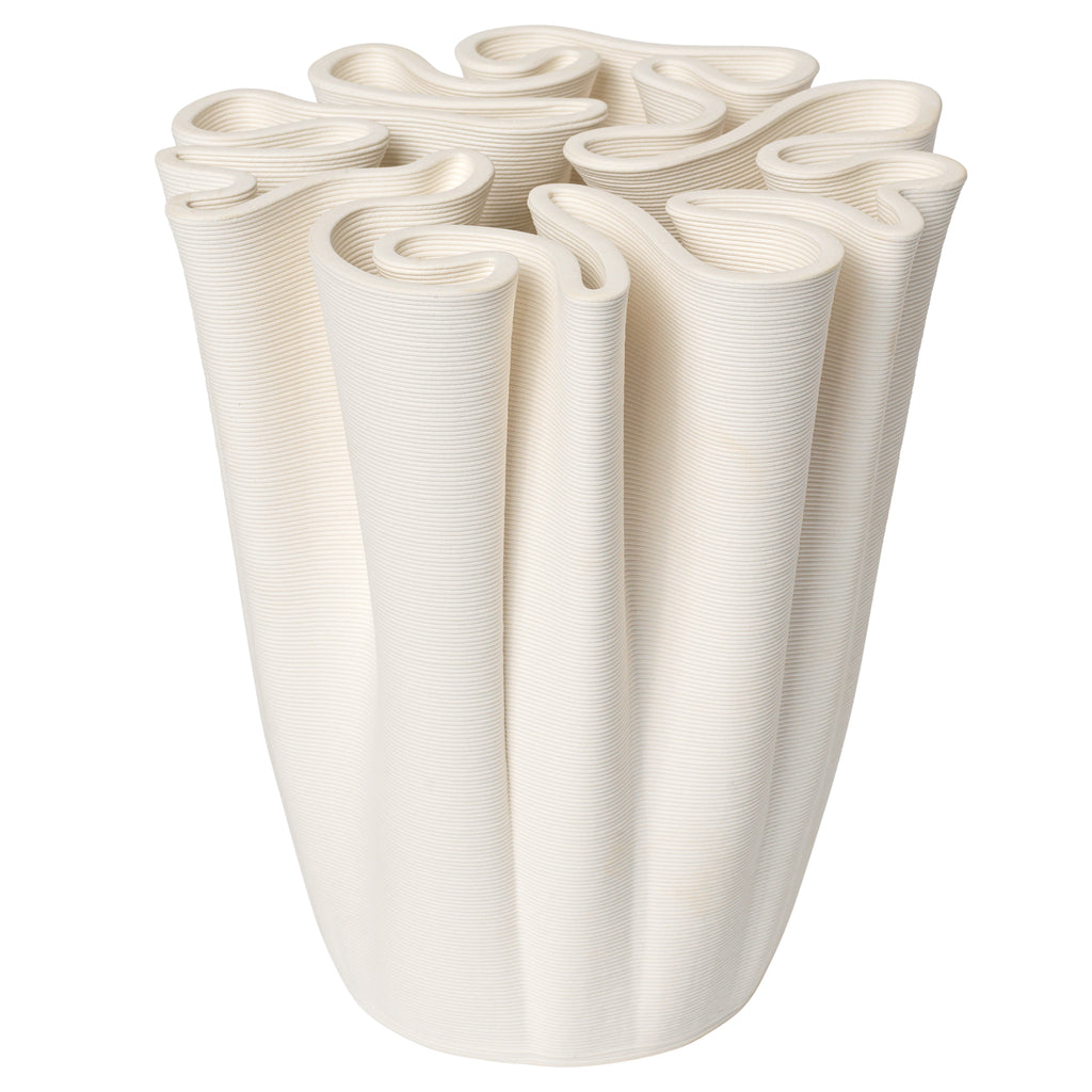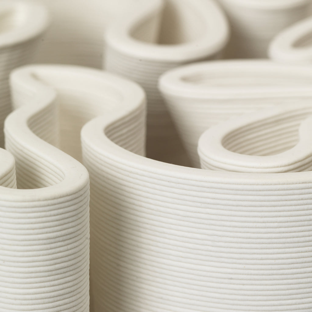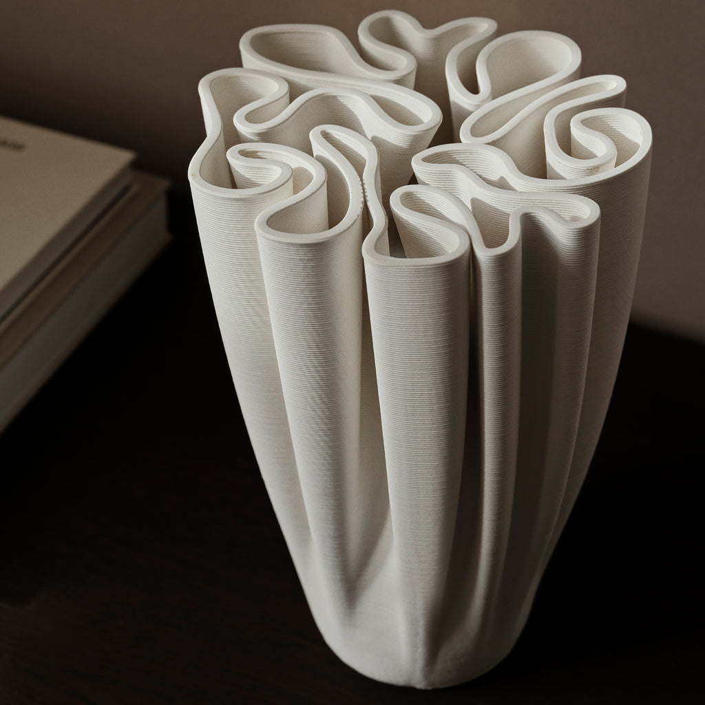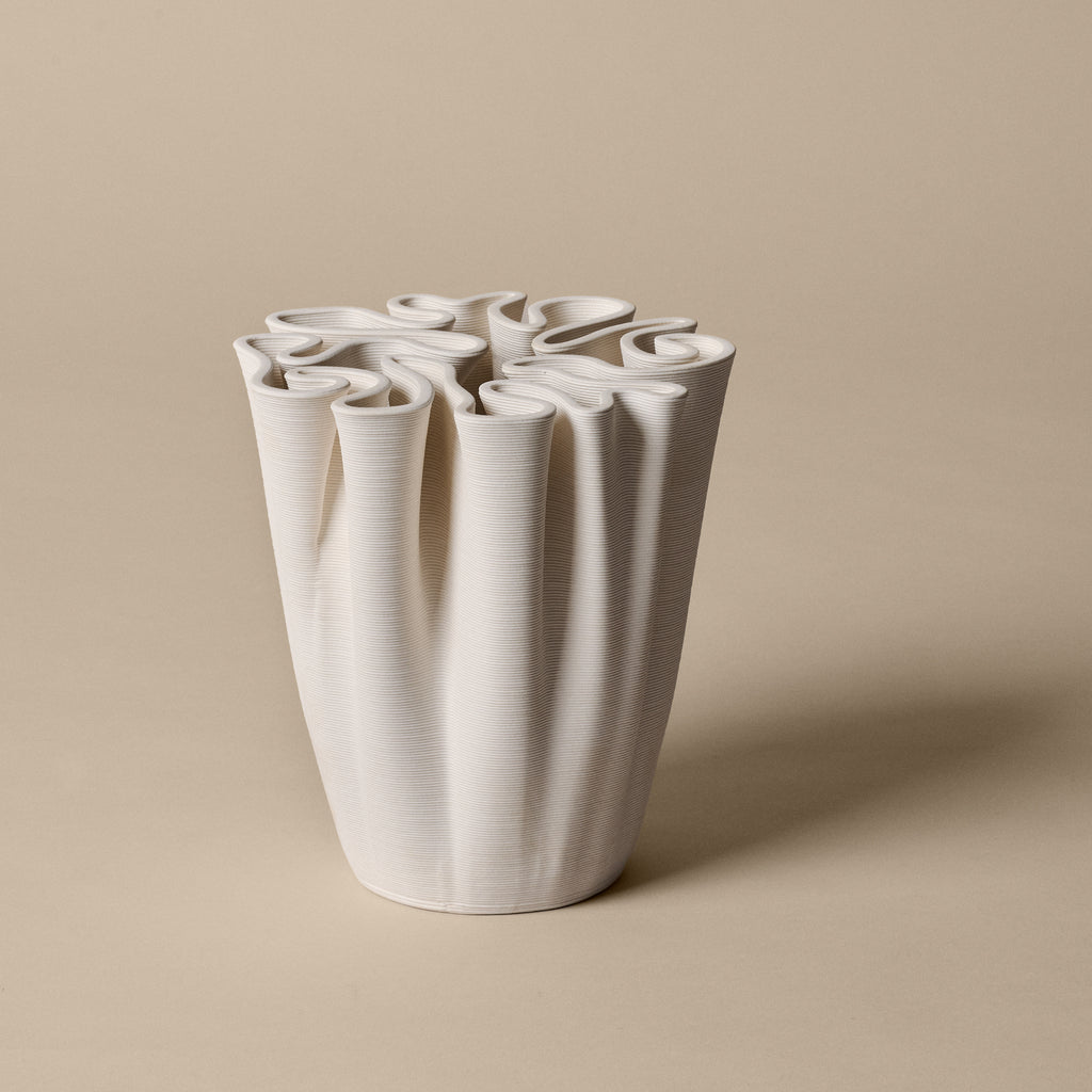 This smaller variation of the Dedali Vase echoes the elaborate patterns of a 'Dédales' or labyrinth, offering the same fusion of art and utility in an updated form. Crafted from 3D-printed ceramic, its intricate labyrinth-like top is both visually striking and functional, perfect for arranging small floral displays in a voluminous, Ikebana-inspired style.