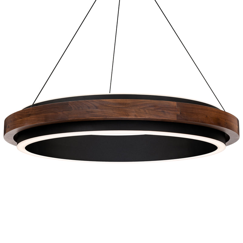 Crafted from rich walnut wood whose grain adds texture and character, the organic modern Delaney pendant light features a beautifully rounded frame that encircles a sleek LED diffuser, offering soft, even 3000K illumination. The 29-inch pendant is finished in black complemented by dark walnut.