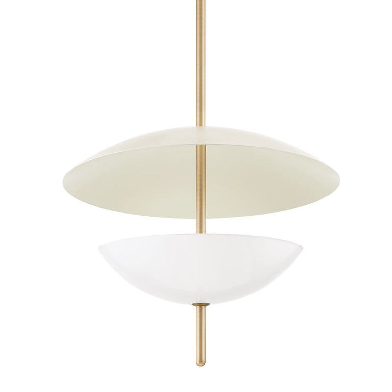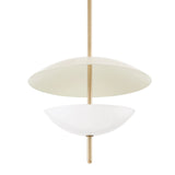 Dion captures modern organic design with its round, slender Patina Brass rod that pierces through a pair of domed shades in warm, neutral tones. The opal glossy glass shade below fills with a soft glow and casts an uplight that reflects off of the larger Soft Sand dish above. This pretty pendant defines subtle sophistication.