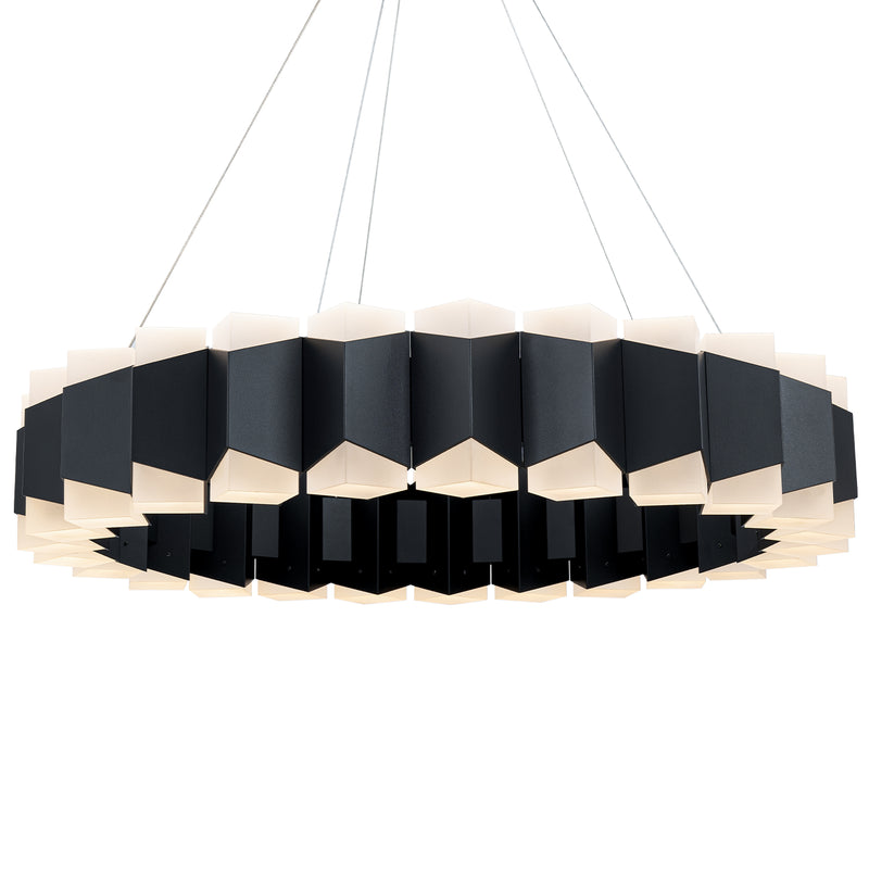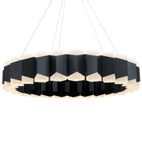 Evoking the grandeur of an Elizabethan ruff, the Dolman pendant features interconnected triangles finished black forming a frilled collar of light. The frosted acrylic points are illuminated by LEDs, casting a warm 3000K glow both upwards and downwards, for a beautifully ambient atmosphere.