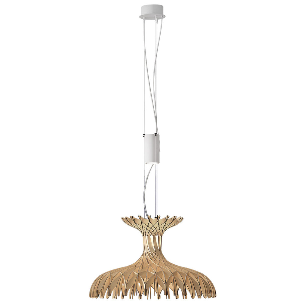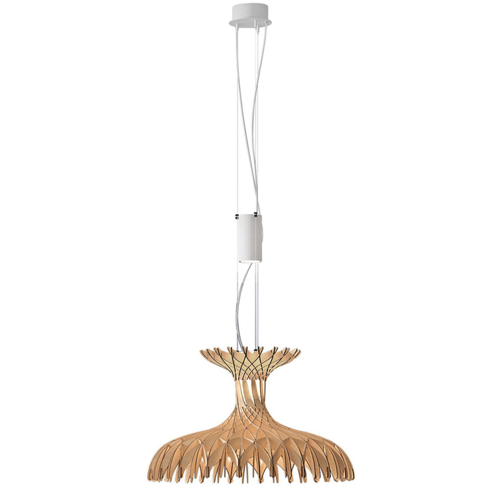 The integration of design, art and light in architecture dates back to a long time ago, and maybe this is the reason why lamps have gradually stopped being just an item emitting light to become a light sculpture which confers a special personality to the product and its environment. More than 170 big and small wood fragments are wisely intertwined and sewed one by one to end up in such a jigsaw puzzle.