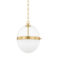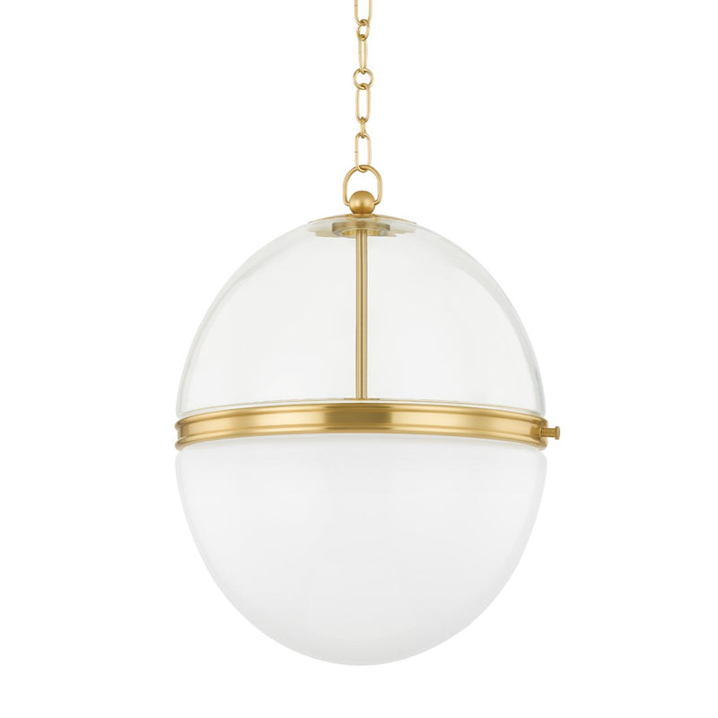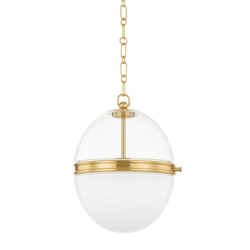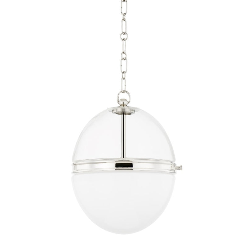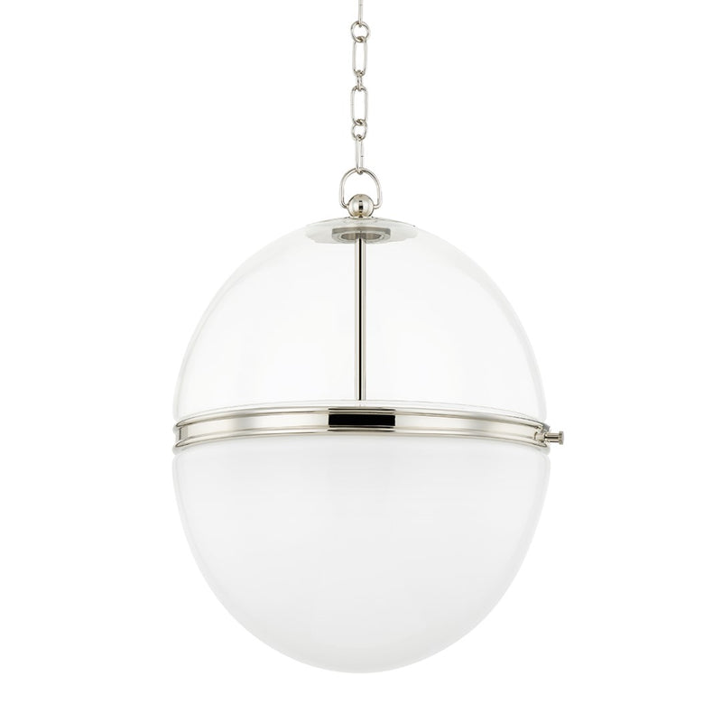 Two different types of glass make this pendant feel special and sophisticated. A detailed Aged Brass or Polished Nickel band at the center separates the clear glass above from the opal glossy glass beneath for a visually interesting design that not only draws the eye when unlit, it beautifully pairs a brighter light with a soft glow when lit. This pretty pendant feels right at home styled over the kitchen island.