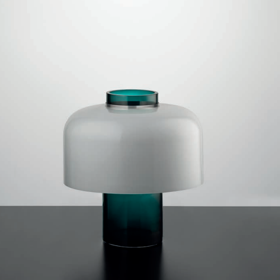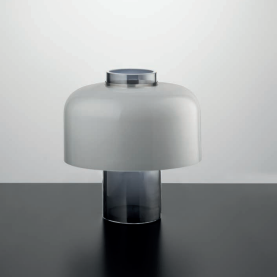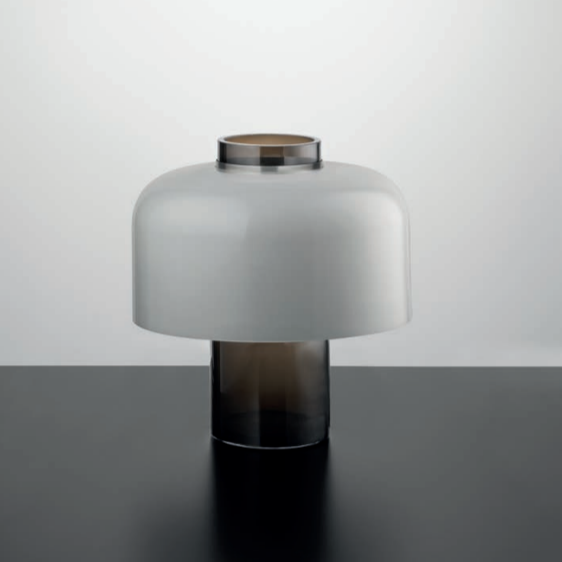 Series of blown glass table lamps in the colours: Amber, smoky, peacock green, transparent silk, steel grey,white and pulegono glass.