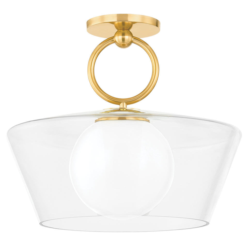 Soft flowing edges and gentle symmetries define this pleasing glass pendant. The clear shade reveals an inner cloud glass bulb, resulting in an even, unobstructed spread of soft illumination. Suspended by an elevated Aged Brass ring and canopy, Elmsford is an instant classic.