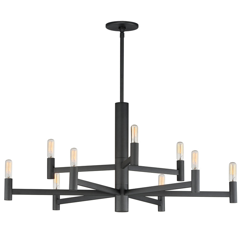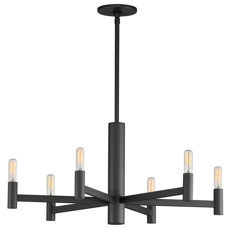 Straight extensions of rectilinear arms emanate from a cylindrical center housing in this transitional design. The candelabra is made in a corresponding cylindrical form playing into the geometries of this streamlined chandelier design. Available in a textured sandy Black or Natural Aged Brass, this collection pairs well with many design aesthetics at an economical price point. Use tubular lamps for an industrial or more modern aesthetic or torpedo shape for an update to the conventional chandelier design.