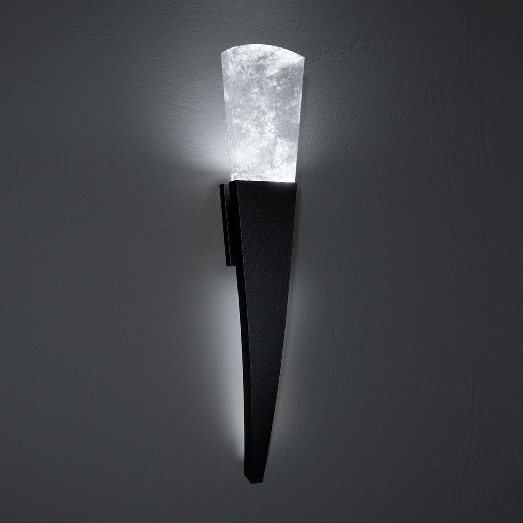 Envision icy comets with long trailing tails of cosmic matter moving across the night sky. Graduated to suggest orbital motion, swathes of metal forms are punctuated with heavenly blocks of Optic Haze Quartz and invisibly suspended from powered aircraft cables. Optic Haze™, made of natural quartz, has unique variations in luster, hue, patterning and texture inherent to this material. When illuminated, the dimension of the crystal is beautifully accented.