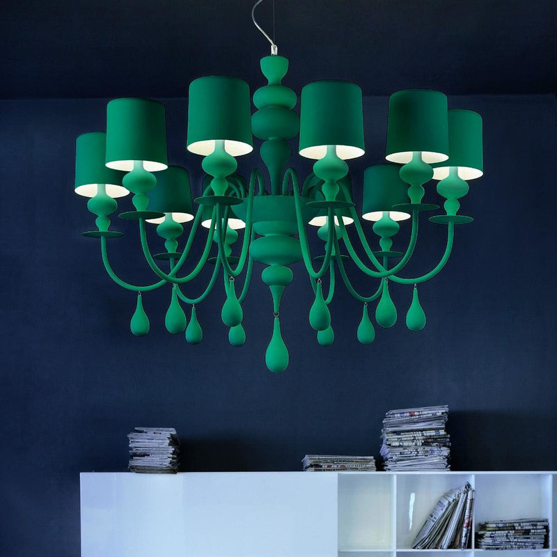 Eva chandelier designed by Fly Design Studio is produced in lacquered resin and polyurethane with lampshades in lacquered aluminum in various colors. Made in Italy.