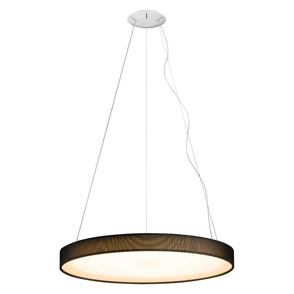 The Fabria Pendant by Page One is a round, direct light fixture which features high-quality, energy-efficient lighting and a sleek, round design that is ideal for indoor applications in residential, commercial, or architectural installations. The round hanging light illuminates your spaces with its soothing and calm LED light source fixed inside an acrylic diffuser. The light is available in black and white finish options. The round frame is panelled with fabric material over a steel skeleton.