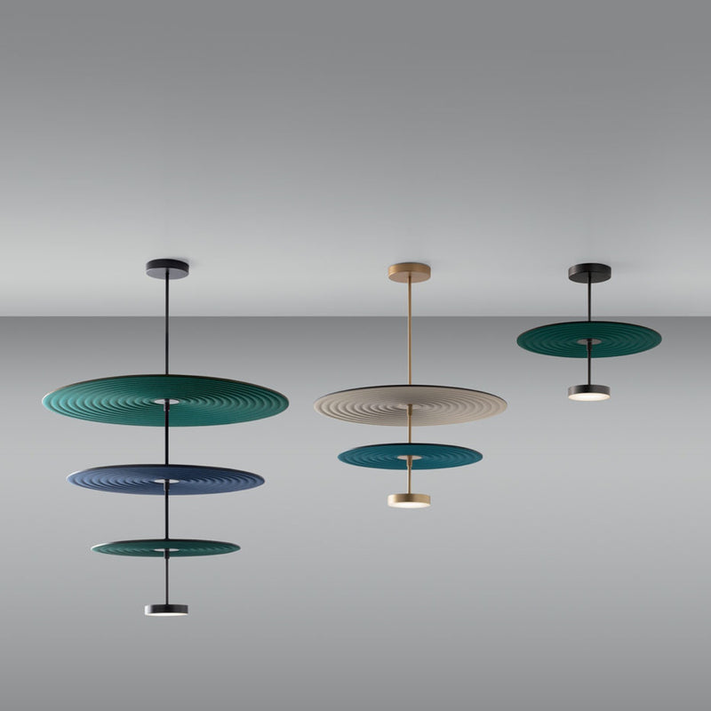 The Feel Suspension by Penta is a modular lighting piece that is created to upscale the atmosphere of any contemporary architecture via skillful management of illumination and sound waves. The textile spiral patterned disc and light diffusers create an extraordinary combination to make a statement in your room. You can either mount it as a pendant or a flush mount light. This small, medium or large pendant comes with a sound-proof fabric disc in light grey, dark blue, Bordeaux, brick, or dark green colors and features the structure in matt black and matt gold finishes.