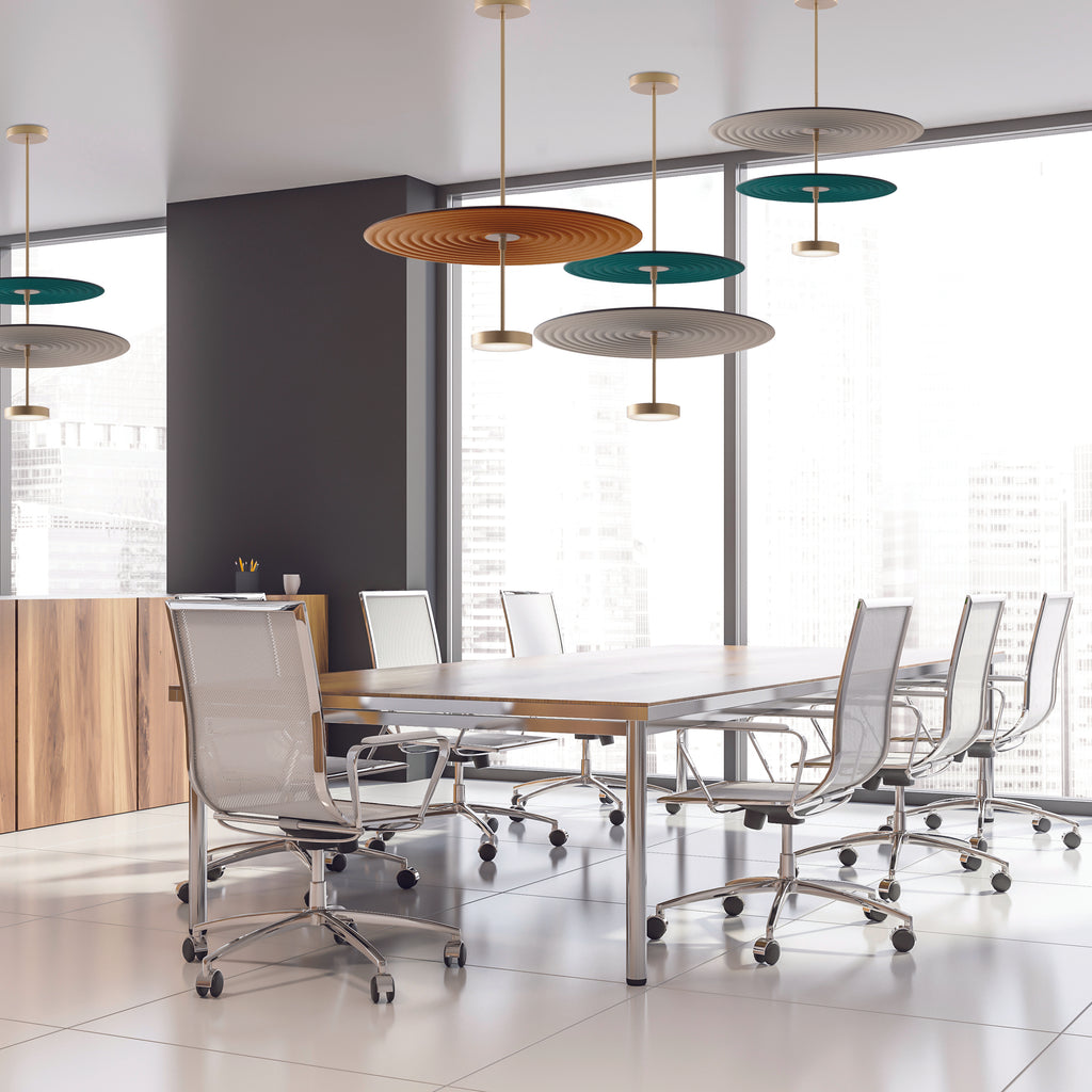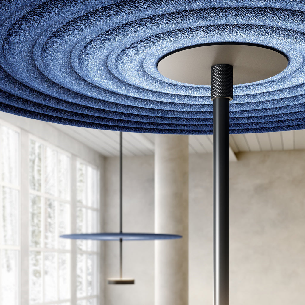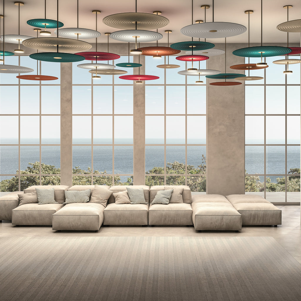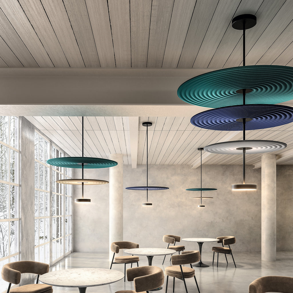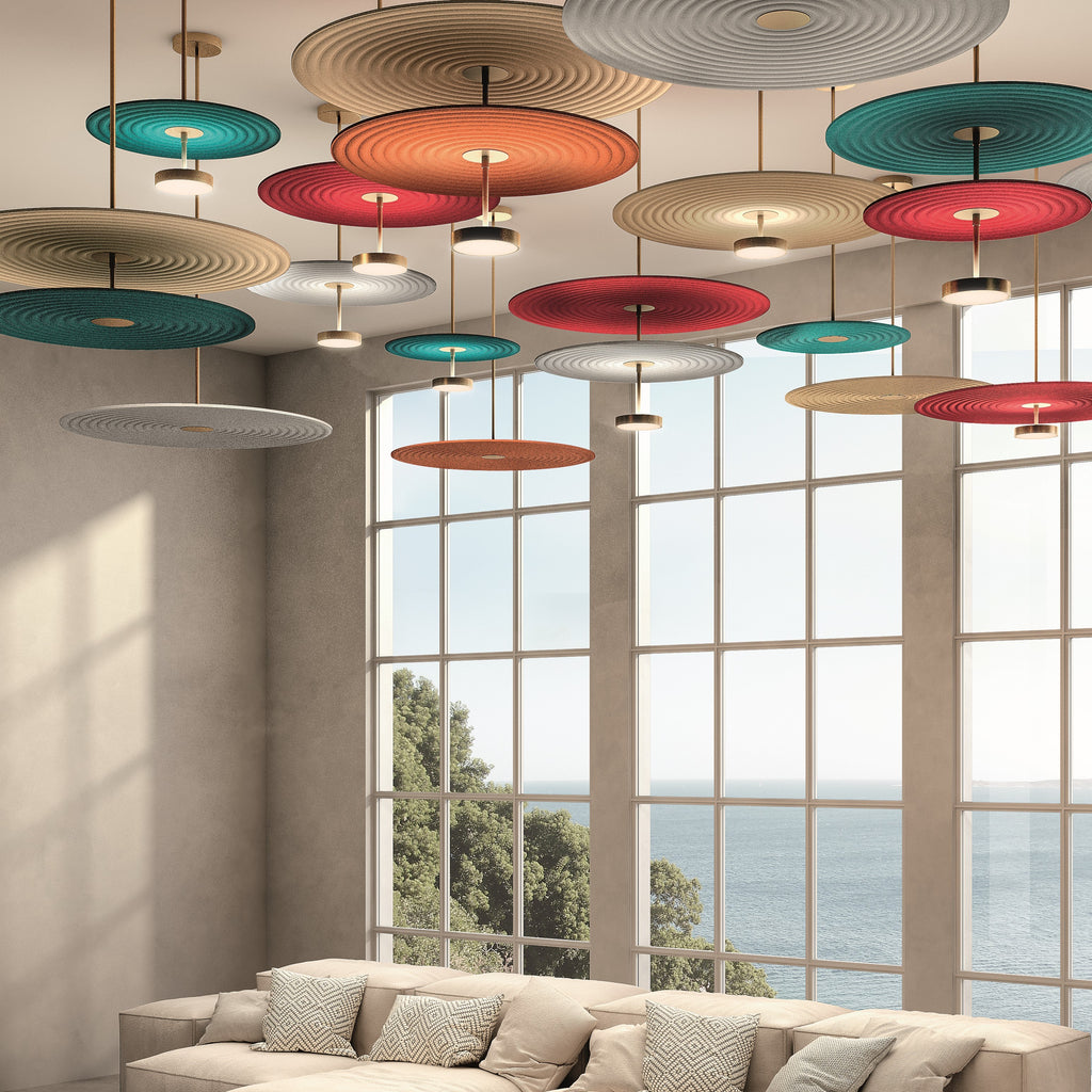 The Feel Suspension by Penta is a modular lighting piece that is created to upscale the atmosphere of any contemporary architecture via skillful management of illumination and sound waves. The textile spiral patterned disc and light diffusers create an extraordinary combination to make a statement in your room. You can either mount it as a pendant or a flush mount light. This small, medium or large pendant comes with a sound-proof fabric disc in light grey, dark blue, Bordeaux, brick, or dark green colors and features the structure in matt black and matt gold finishes.