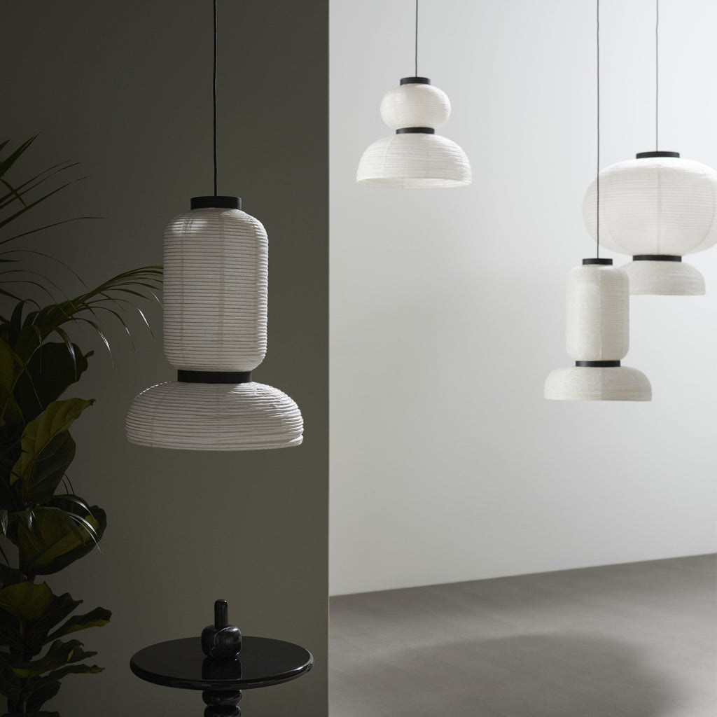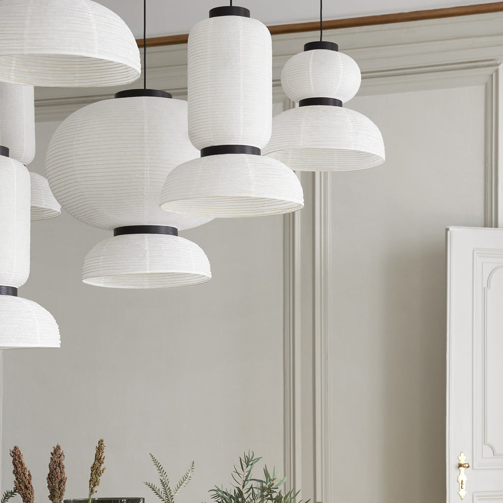 East meets West in Jaime Hayon’s playful tweak of a traditional Asian lantern in contemporary expression. Dating back centuries, paper lanterns have featured in Asia amongst the privileged and the poor, where different colours, shapes and sizes connote different meanings. Here Hayon has dispensed with cultural formalities to create a series of lamps all in white. Hand crafted with rice paper merging various sizes and shapes together. The series is comprised of three different lantern versions and a table lamp in ivory white rice paper with black stained oak accents.