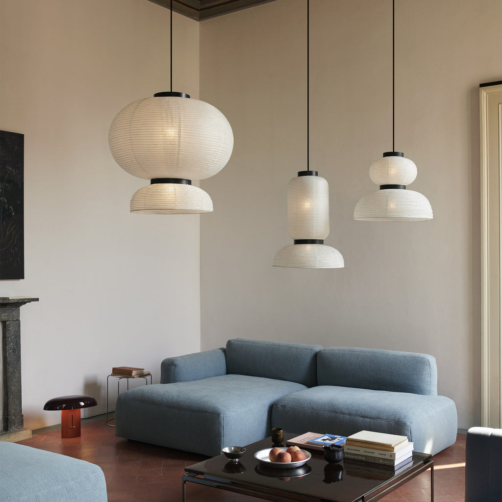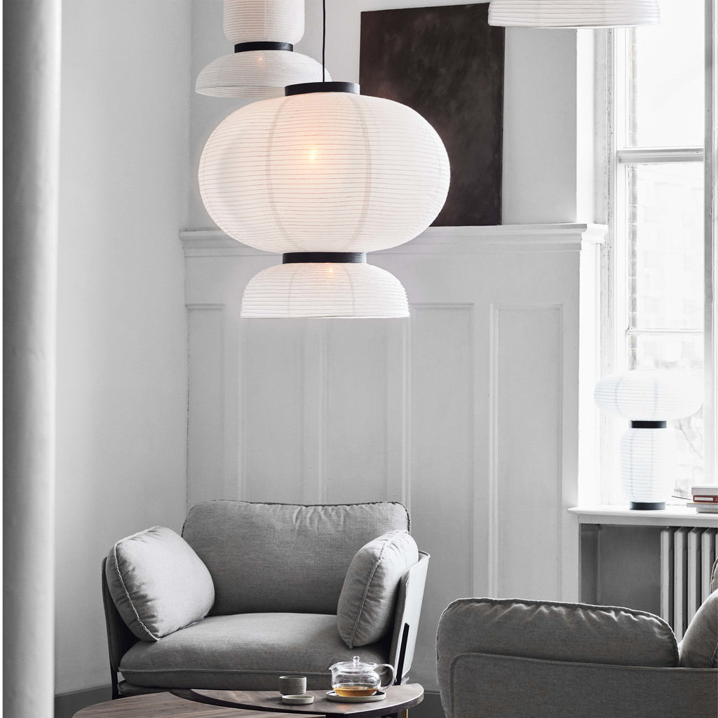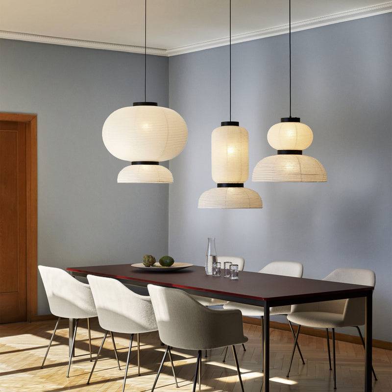East meets West in Jaime Hayon’s playful tweak of a traditional Asian lantern in contemporary expression. Dating back centuries, paper lanterns have featured in Asia amongst the privileged and the poor, where different colours, shapes and sizes connote different meanings. Here Hayon has dispensed with cultural formalities to create a series of lamps all in white. Hand crafted with rice paper merging various sizes and shapes together. The series is comprised of three different lantern versions and a table lamp in ivory white paper with black stained oak accents.