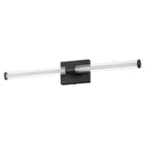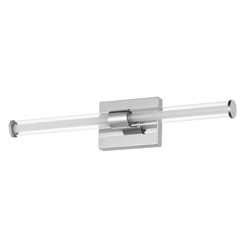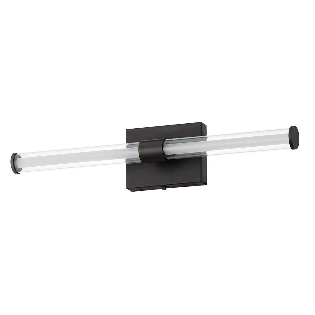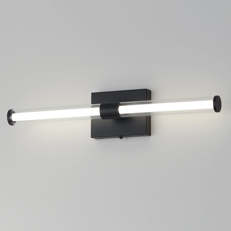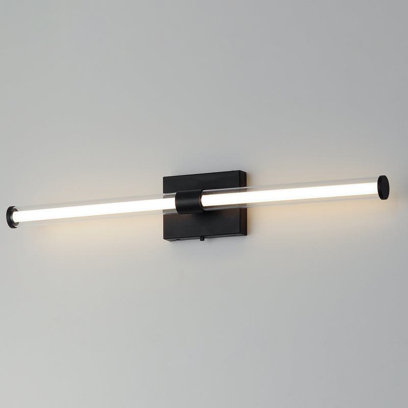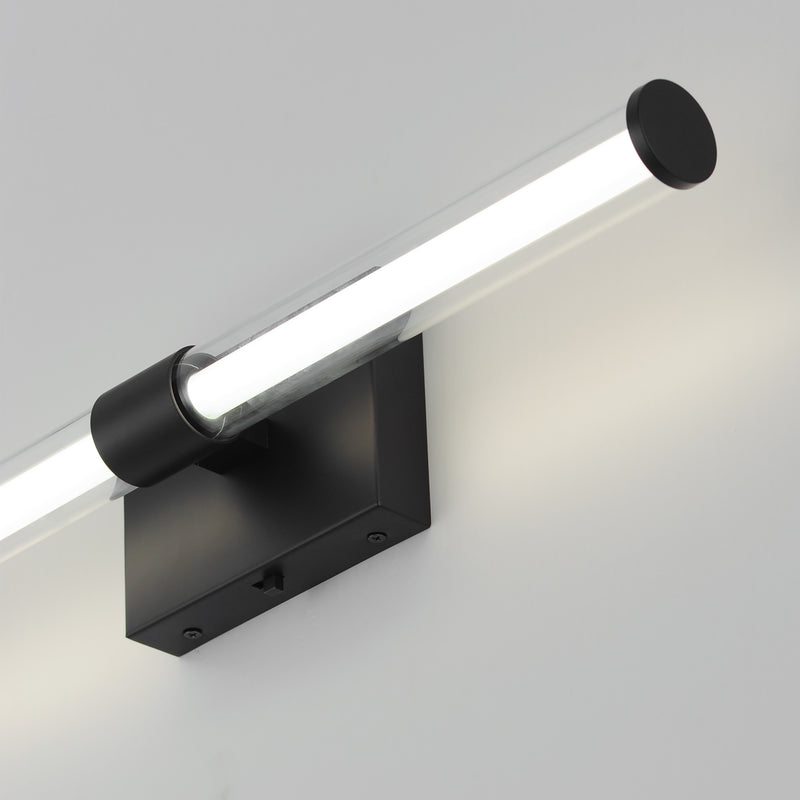 Within the void of clear glass, a white cylindrical tube of LED light extends in two directions. The evenly distributed light source can be adjusted to 5 selectable color temperatures, from warm 2700k to a cool 5000K and neutral white light sources in between. Available in three finish options: matte Black, Natural Aged Brass, and Polished Chrome, these sconces are great for use in bathrooms and along corridors with extensions less than 4 inches for ADA compliance.