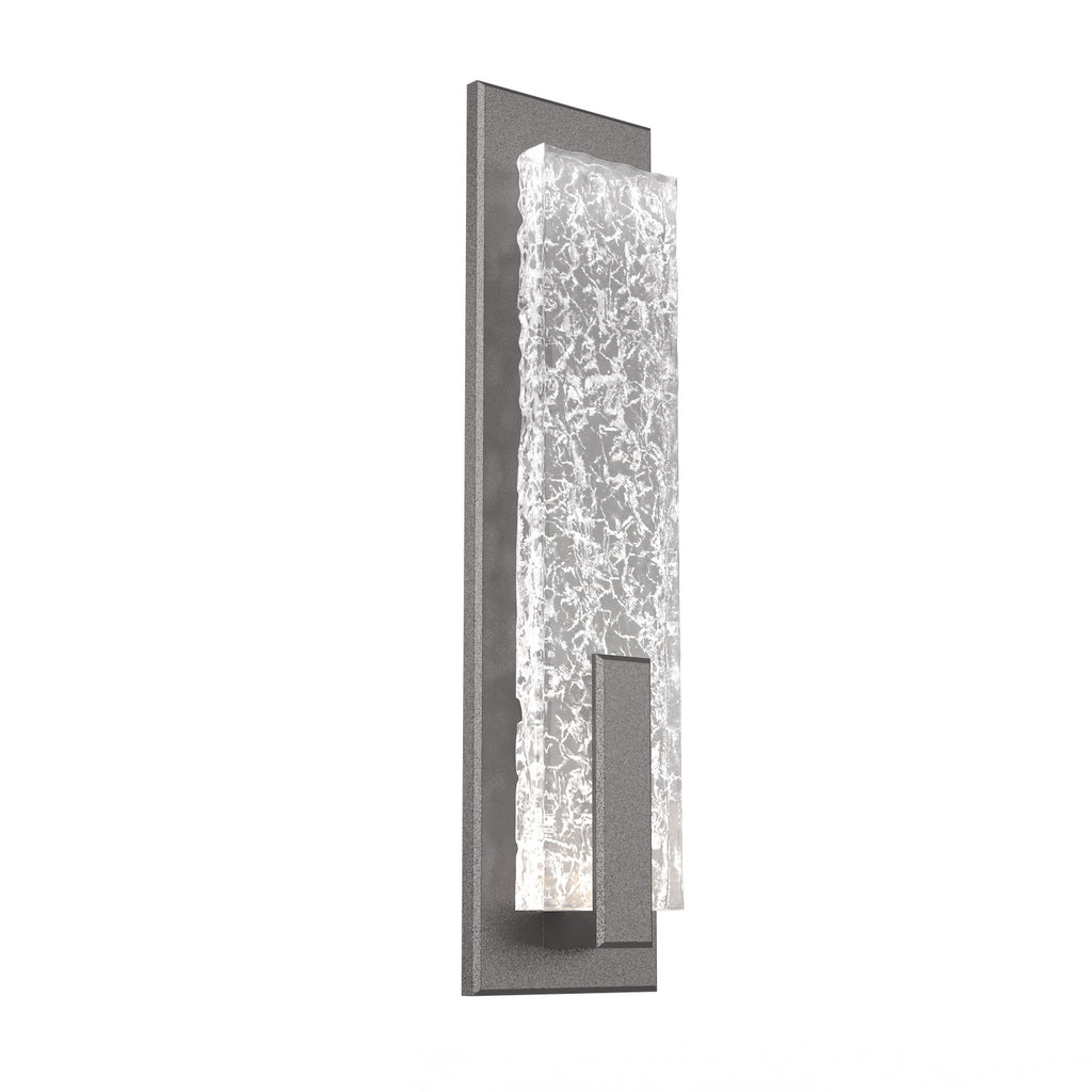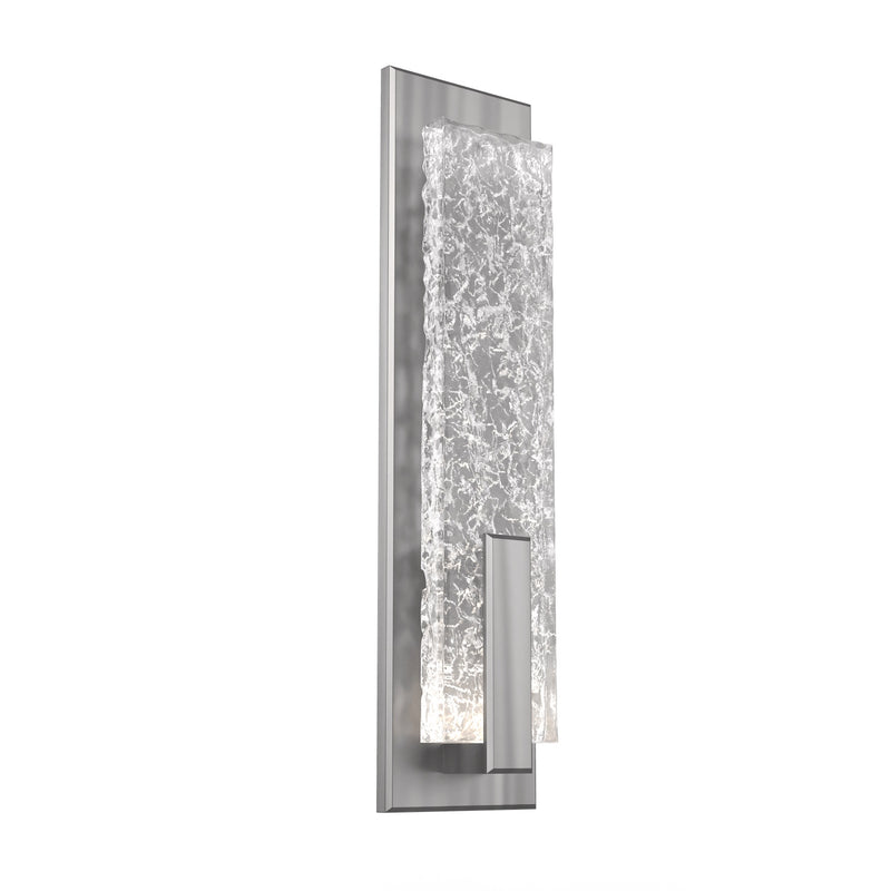 This modern wall sconce design pairs a floating panel of thick artisan cast glass with beautifully finished metalwork details. Integrated LED lighting at the base of the panel highlights the unique characteristics of the glass. This modern wall sconce lighting is the perfect pièce de résistance for a variety of interior spaces.