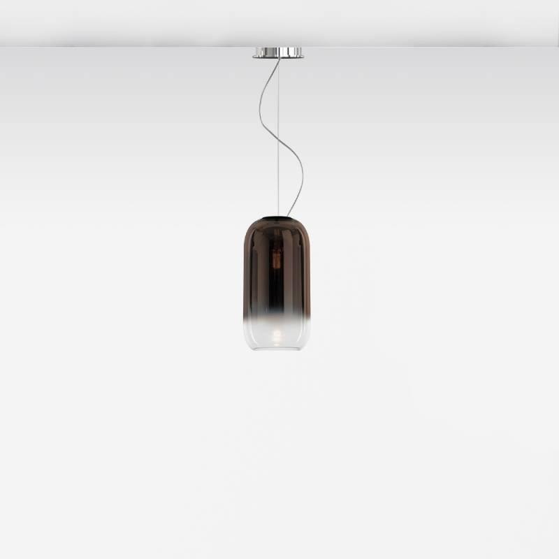 Give your interior an artistic touch with this Gople Suspension Lamp by Artemide. It is a simple yet appealing suspension lamp that has a hand-blown glass capsule-like diffuser with an E26 light source. This diffuser softly diffuses the light produced by the bulbs and adds ambient lighting to your space. This mini or classic lamp comes in five finishes: transparent chrome, transparent copper, transparent white, transparent blue, transparent bronze.