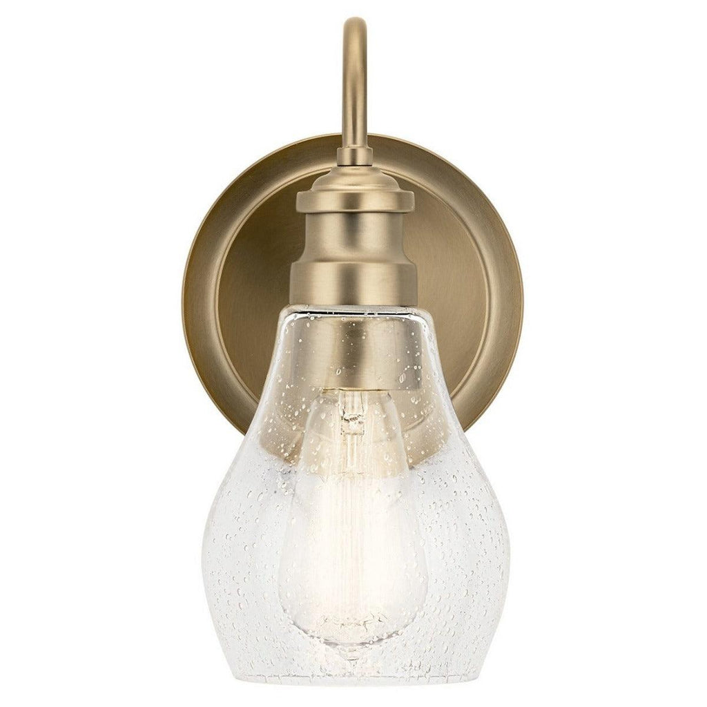Add a traditional touch to your bathroom by picking up the Greenbrier Wall Sconce by Kichler. It has a minimal design with teardrop-shaped shades with a transparent seeded glass diffuser. The arms of this fixture have Black, Brushed Nickel, and Classic Bronze finishes complementing any bath theme. It uses incandescent light bulbs. . It requires a medium-sized socket base for installation and a 120V power supply for performing.