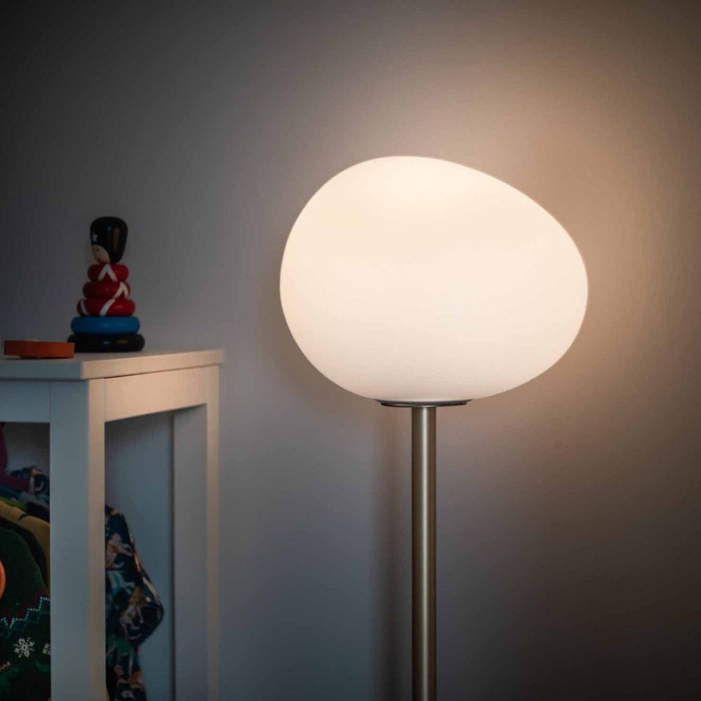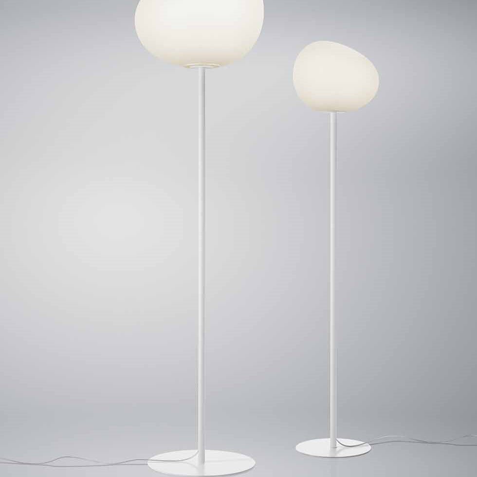 A product of natural inspiration and extensive research, Gregg's shape is reminiscent of a large pebble, its surface polished by the water. It could even be seen as the egg of some mythological beast, a symbol of creation and re-birth. Pure volume with a familiar ease of interpretation, yet one that is surprising, because Gregg's asymmetric shape changes depending on the point of view of the person observing it. This is a new solution where a traditional material like glass becomes a tool in the designer's hands to give an original character to an environment. The Gregg collection is one of the most versatile and transversal and can be easily placed in any type of setting. In the home environment the warm, uniform light produced by the white satined diffuser and its essential style have a strong functional and decorative value. Thanks to the closed shape of the diffuser, the bulb is screened in all directions, which protects from dazzle and makes it easy to place even at different heights. This model belongs to Foscarini Mix & Match System, so it is perfect both as individual piece, adding character to a room, and combined in compositions of different functions from the same series, coordinating the entire atmosphere within a space. The frame of Gregg floor is available in a palette of three colors, always in matte finish: you can choose between the soft tone of a warm and deep gold, the colder and sophisticated feeling of graphite or white, a more neutral choice that integrates easily in any environment