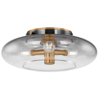 Right angles, knurled details, and a lustrous Patina Brass finish create this eye-catching flush mount that nods to industrial futurism. Three arms extend from a central rod, recalling the hefty spokes of a vault door handle. The ombre smoke glass shade softly diffuses light throughout kitchens, living rooms, and hallways.