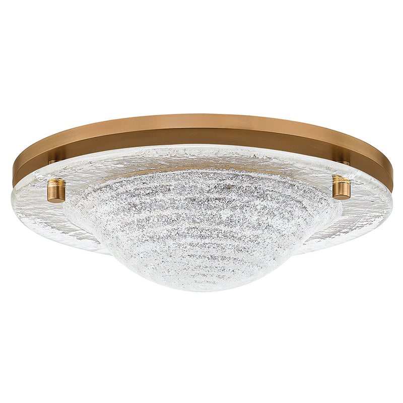 The striking silhouette of Halston hovers between the earthy and ethereal, the icy and molten. Both a functional flush mount and a work of art, this design-forward fixture seems to drip from the ceiling pan as if it were laden with light. The cast piastre glass lends an otherworldly texture, with a striking concentric ring pattern visible from below. Warmed by the lustrous Patina Brass framework, Halston transcends the ordinary with its captivating glow.