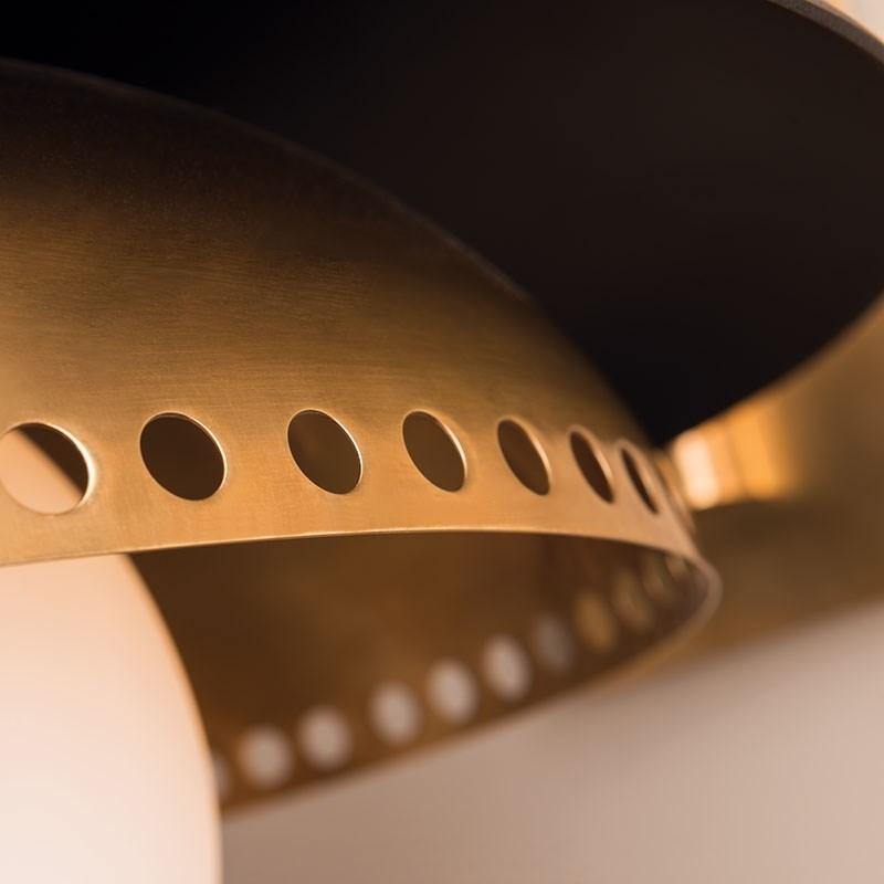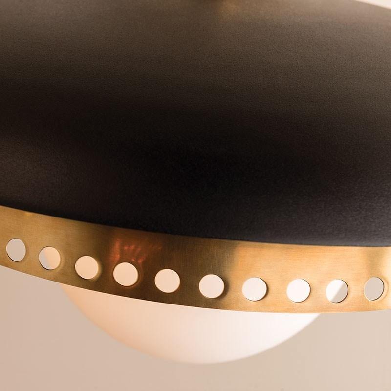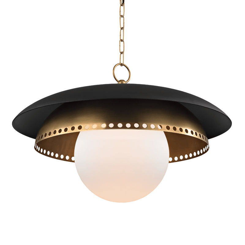 The Herkimer Pendant by Hudson Valley is a perfect fusion of modern and vintage aesthetics. The thick top shade contrasts in texture and width with the perforated shade it envelops. It incorporates E26 medium base - A19 bulb socket. At the center, an opal etched ball hangs low, softly diffusing the light. This unique pendant is available in two size variants - small and large.