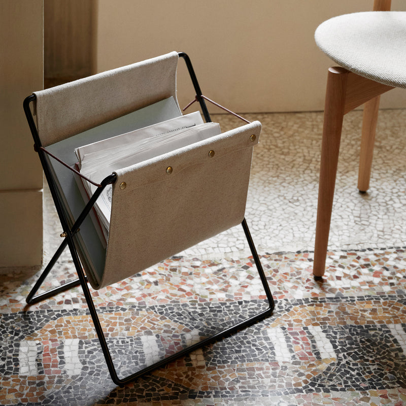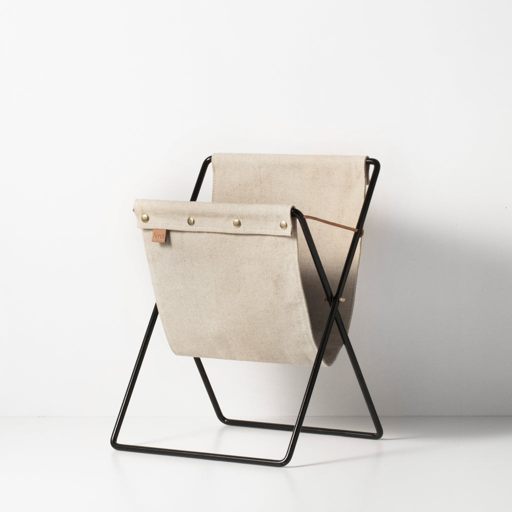 Ferm LIVING’s magazine rack fuses a vintage aesthetic with a modern mix of materials. The durable canvas holder is set on a powder coated metal frame secured with leather laces. Brass press-studs and a leather logo tab finish this retro-inspired design