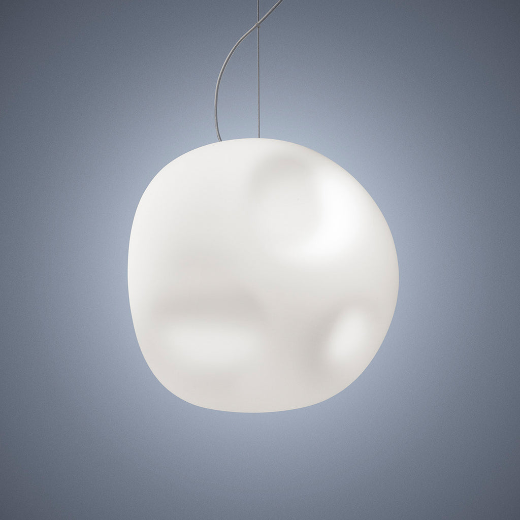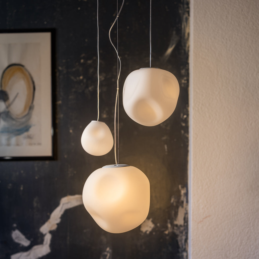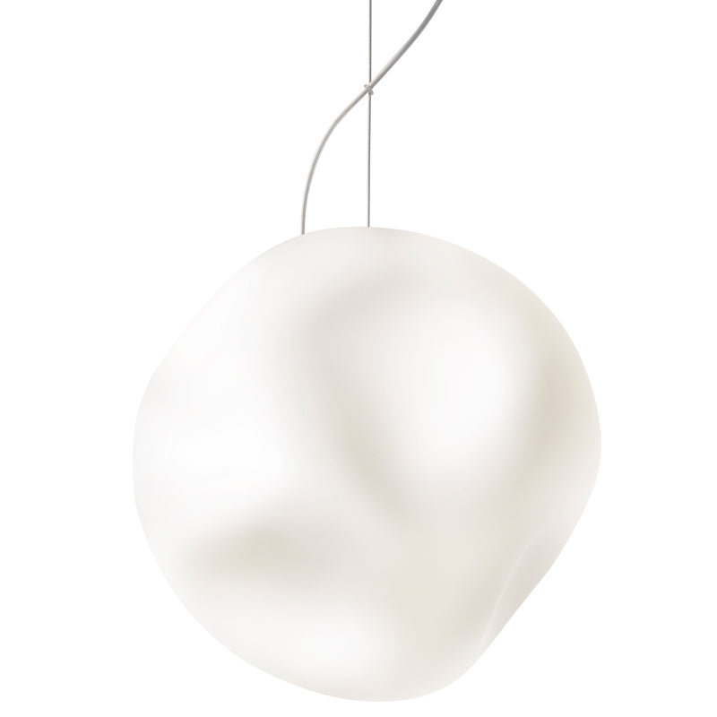 Pendant lamp with diffused light. Hoba draws inspiration from the asymmetrical and irregular shape of the meteorite for which it is named, discovered in Namibia in 1920. The diffuser is made in mouth-blown acid-etched opaline glass, using a glass-blowing technique without rotating the glass in an open mold. This has made it possible to obtain a family of similar but always variable objects, serially produced but with the unique characteristics of things made by hand. The warm and enveloping light is perfect for illuminating spaces on its own or in compositions with the various available sizes. The suspension system features a self-supporting cable in the small and midi versions; the medium and large versions include a steel cable and transparent electrical cable.