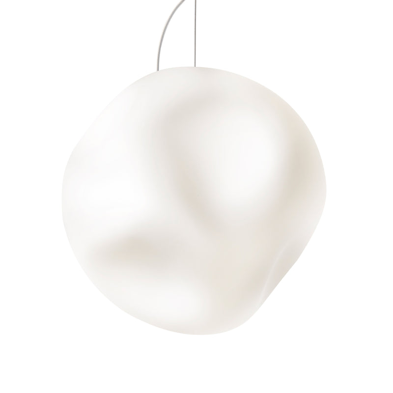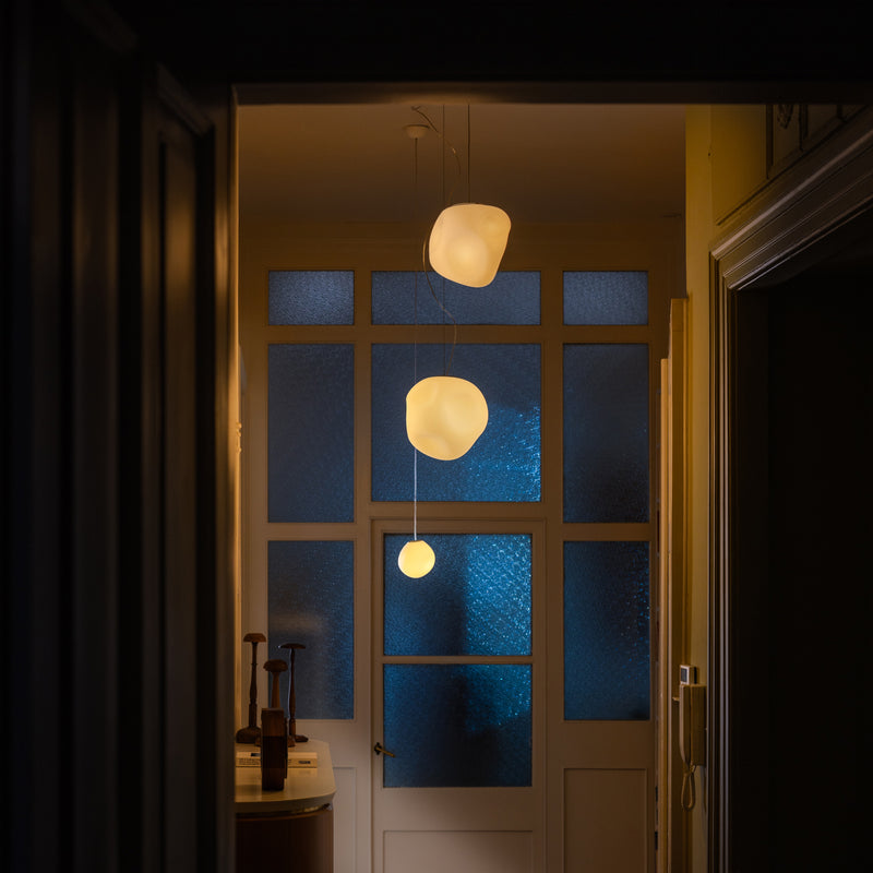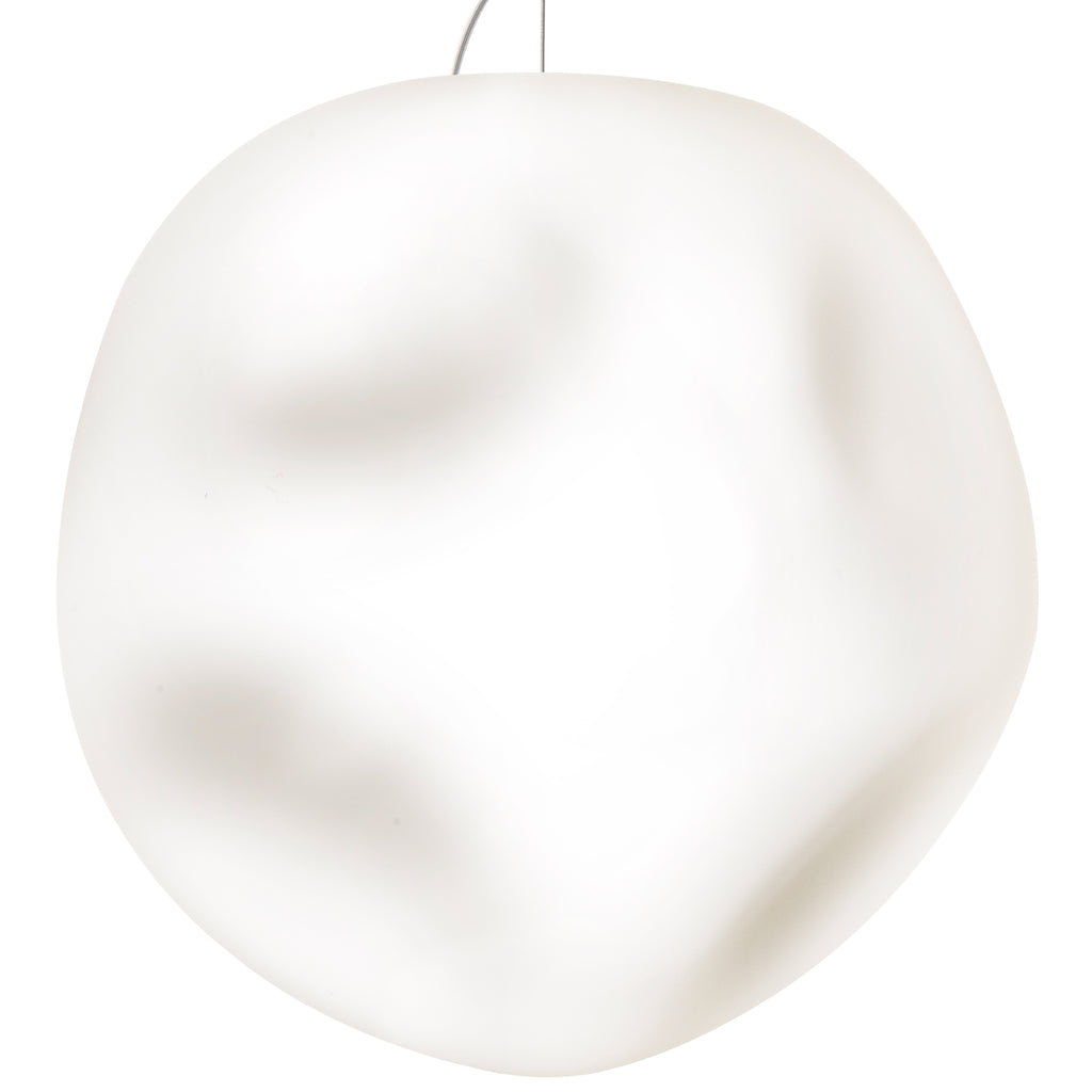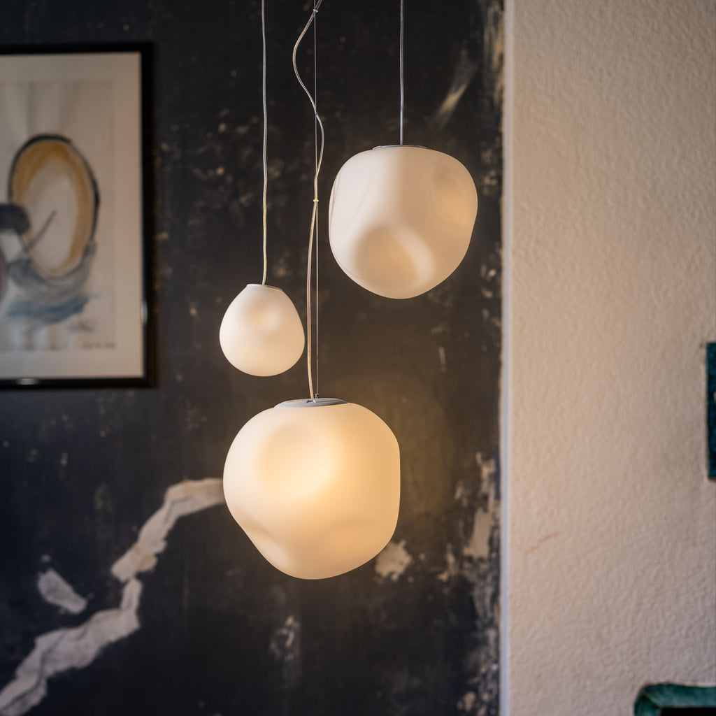 Crafted in matte blown glass, the Hoba lamps feature an asymmetrical and irregular shape, reminiscent of a crystallized meteorite in the moment of flight. Created with a special glass blowing procedure, their irregular forms are always slightly different from each other, forming a collection of consistently unique pieces, produced in series but with the characteristics of handmade uniqueness. Available in various sizes and for different functions, they emit warm and enveloping light.