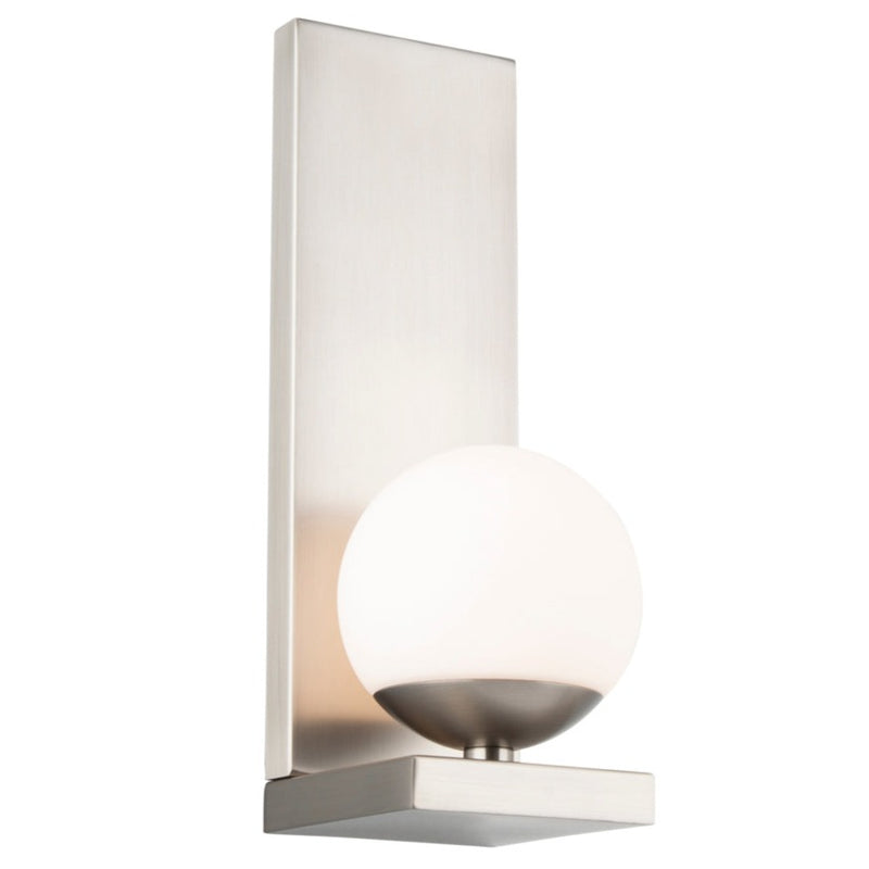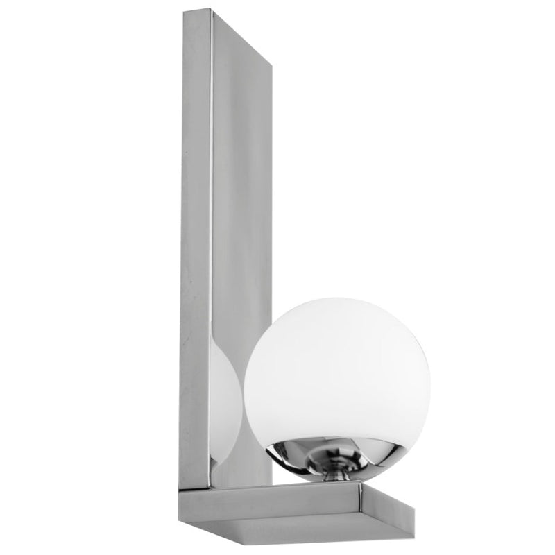 Opal glass sphere held aloft on a ledge. A mid-century inspired contrast of forms.