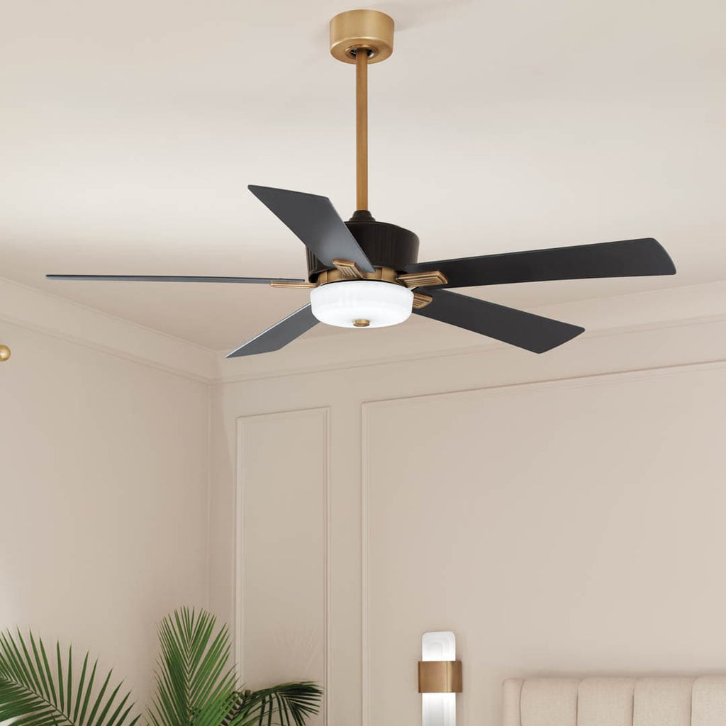 Inspired by an Art Deco silver serving set, the 56-Inch Icon ceiling fan comforts and illuminates in style. Its clean, crisp white body and blades are complemented by linear details along the motor housing, blade irons and the Etched Cased Opal glass. Exquisite natural brass details complete this intriguingly gorgeous fixture. Refine your Art Deco vision with the clean shapes and exquisite detailing of the Icon ceiling fan Includes an 8-inch integrated, dimmable 3000K LED light, delivering ambient light to the room Its 65K CoolTouch Full Function Remote Control System lets you dim the light, choose from 3 speeds, and select forward or reverse Clean, crisp and classic, its white finish beautifully complements its rich natural brass details Steel body and plywood blades are ideal for long-term use Ideal for rooms 150-300 Square Foot such as a bedroom, living room or kitchen DC motor fans are lightweight, whisper quiet, and us up to 70% less electricity than an AC motor Its 90 Color Rendering Index (CRI) brings out your room’s colors Downrod installation with a maximum stem tilt up to 22 degrees What's In the Box? (5) Fan Blades, (5) Blade Irons, (1) 6-in Downrod, (1) Canopy, (1) Mounting Bracket, (1) Motor/Housing, (1) Glass, (1) Mounting Hardware, (1) Remote Control.