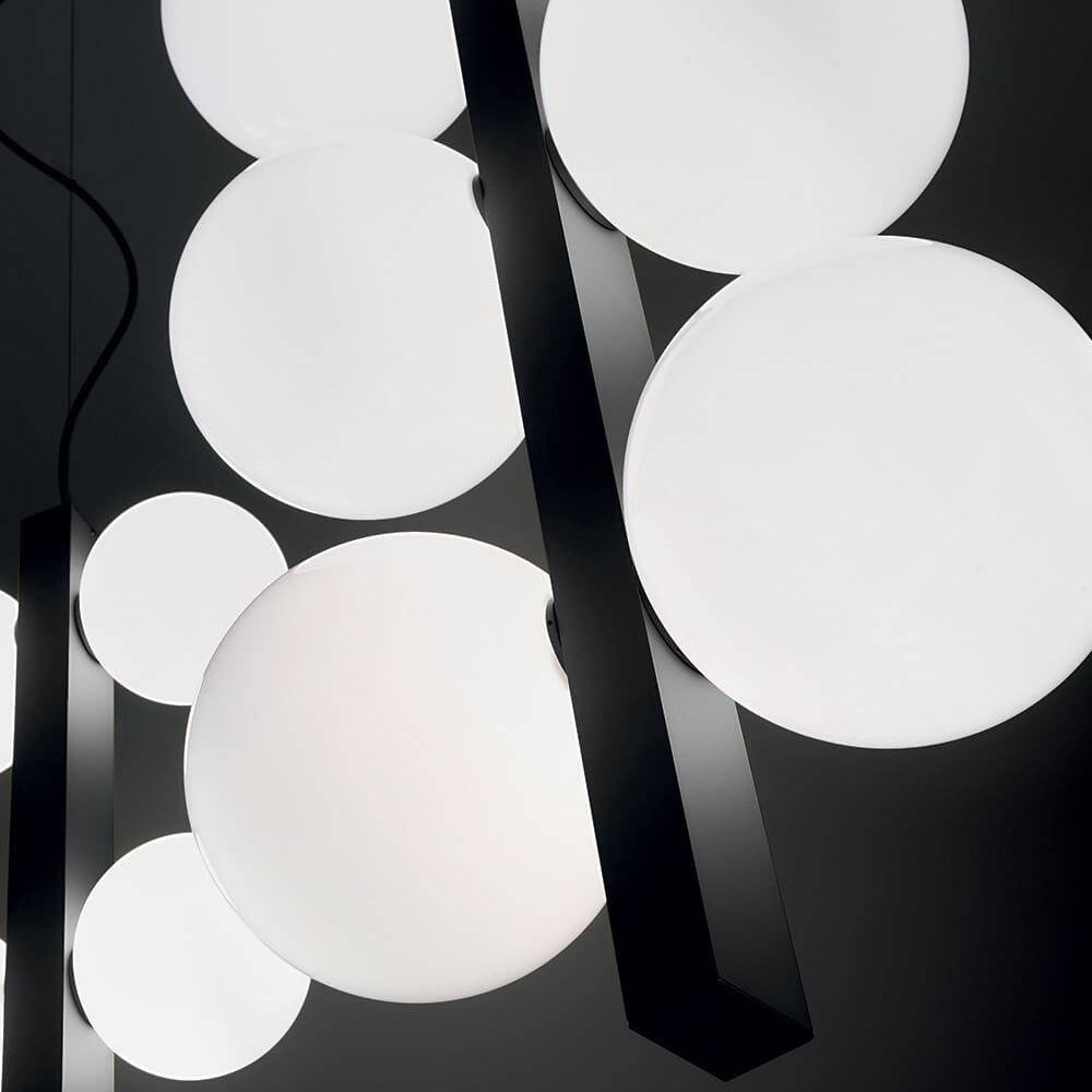 Blown glass spheres, apparently suspended in the void, vertically or horizontally, remain well anchored to the metal structure, a suspension lamp to illuminate spaces with new geometric shapes. we thought of the sphere, which has always been an elementary and harmonic form.