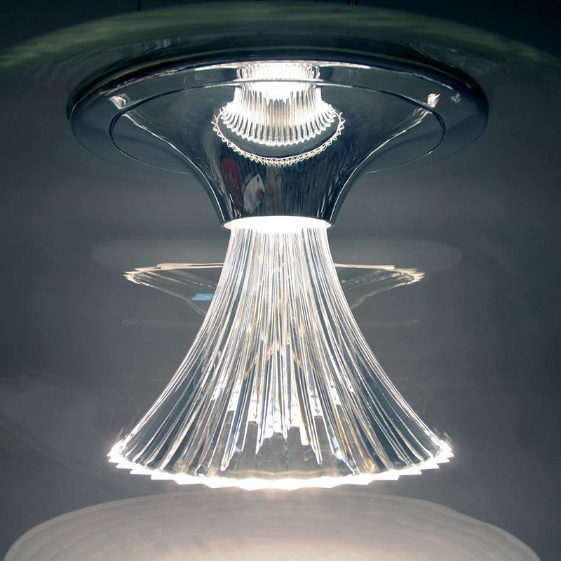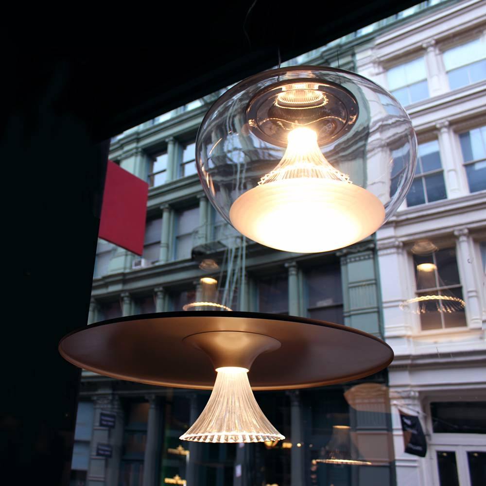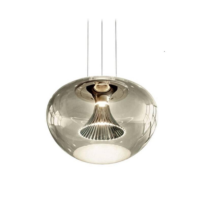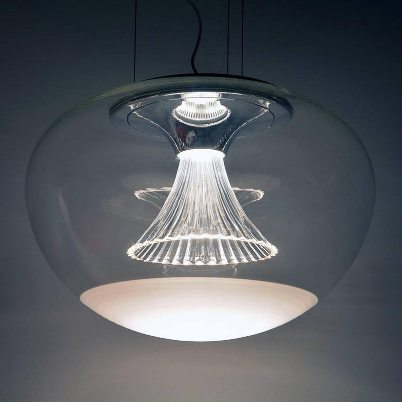 This Ipno Glass Suspension Lamp by Artemide is a visually-appealing lighting piece that beautifully complements any home, party hall, or restaurant. A blow crystal glass with a glazed bottom surface accommodates a unique optical unit, which directs LED lighting downwards and the glazed section softly disperses it. The functionality of the glazed surface is not only limited to the soft dispersion of light, but it also prevents glare by hiding the internal working of the optical unit.