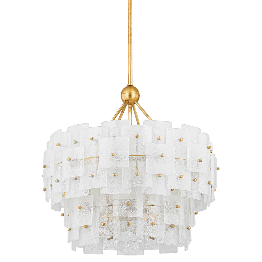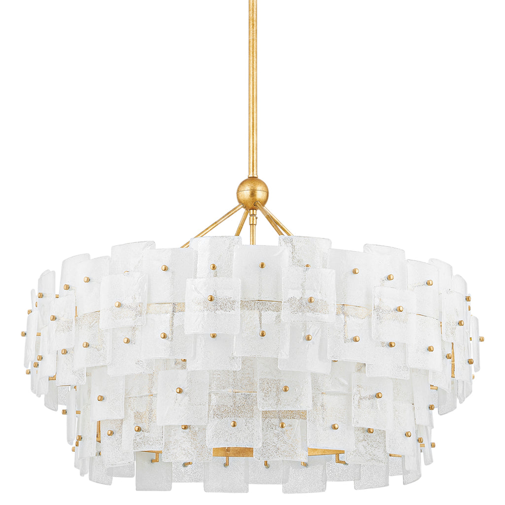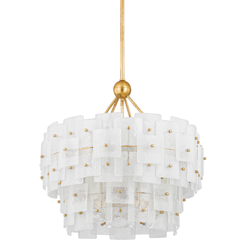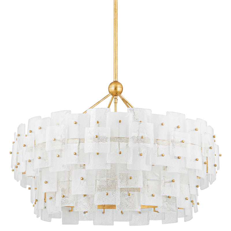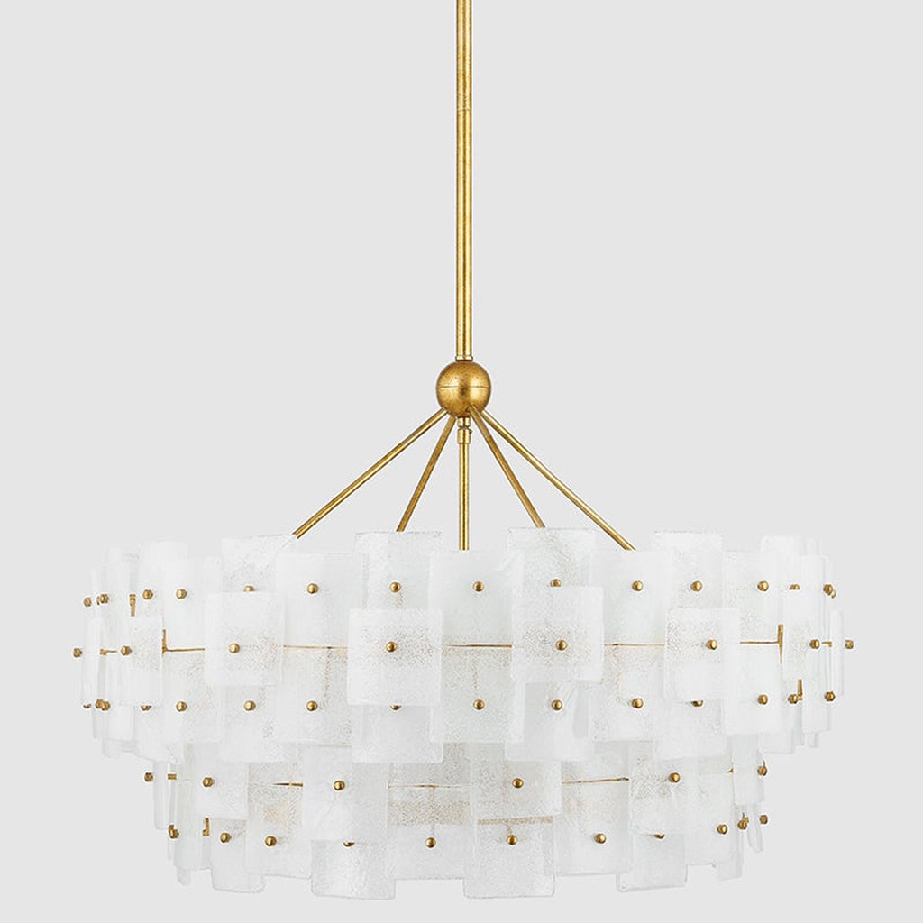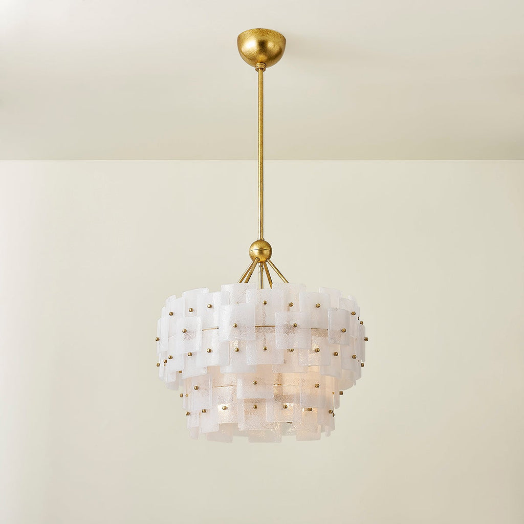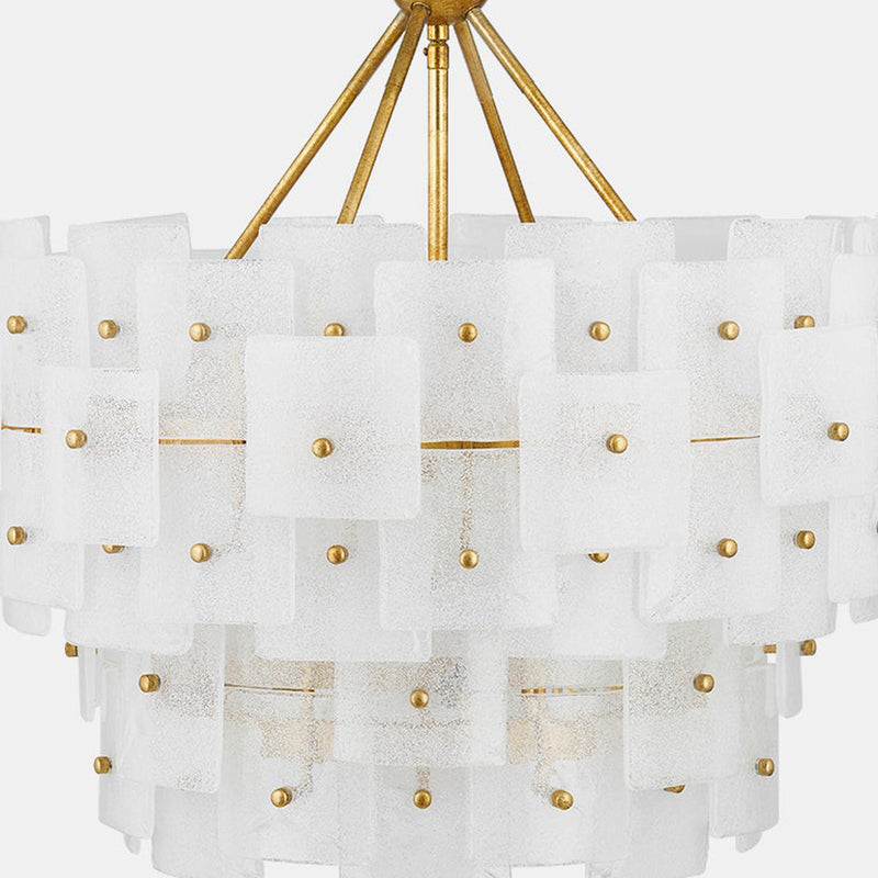 Translucent square glass forms wrapped in layers around the cascading drum silhouette of Jacik, creating an eye-catching statement. Crafted from Candy Glass, each piece is defined by a delicate bubble texture that adds to the artistry and depth of this chandelier. To complement the artistry, Jacik is finished in Vintage Gold Leaf with graceful pins supporting each glass piece like jewelry.