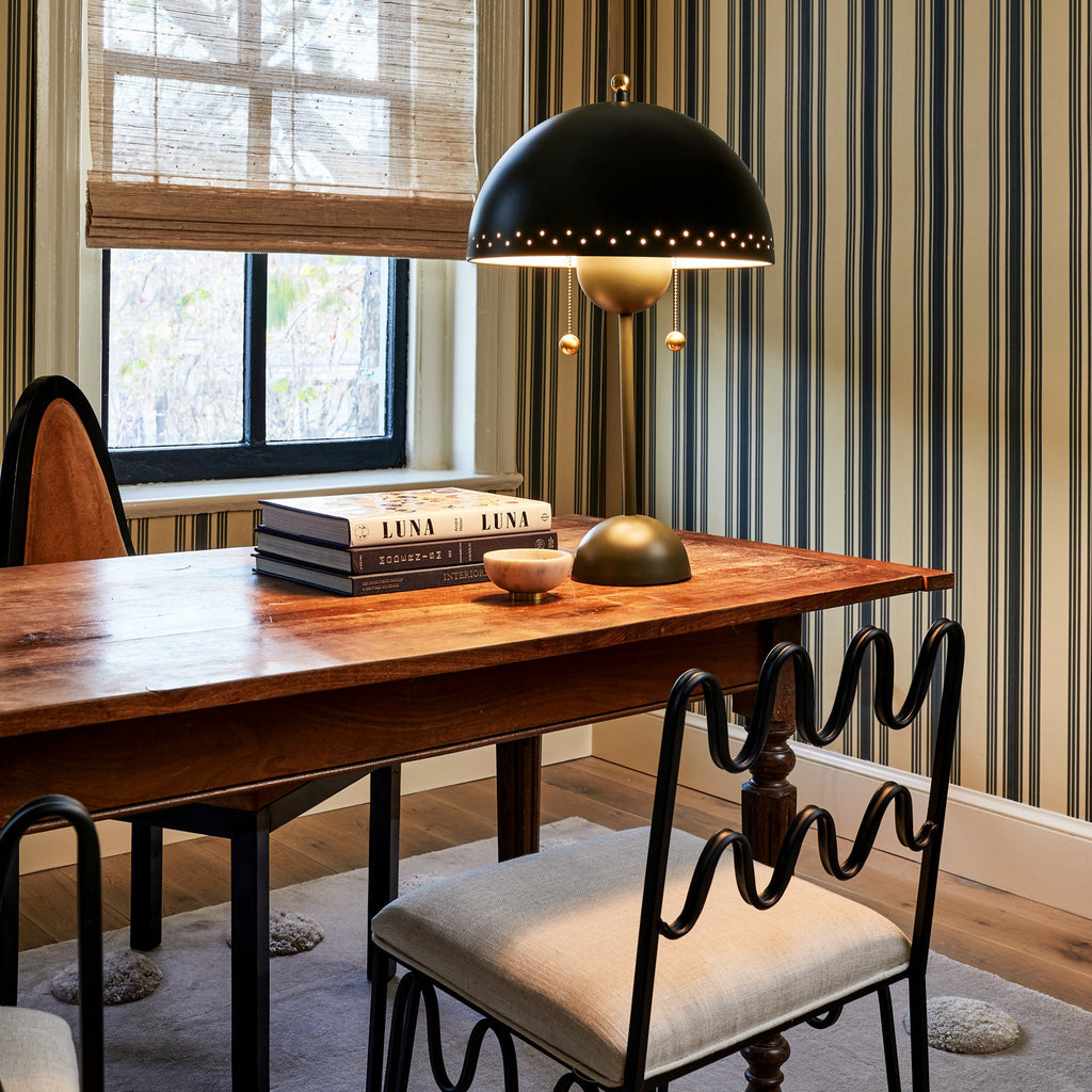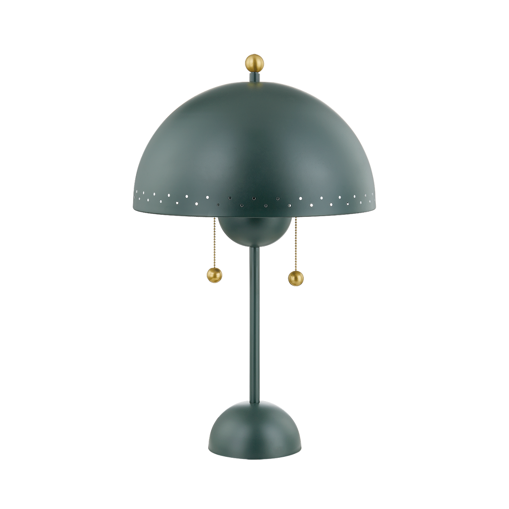 Influenced by midcentury design, Jojo features a dome-shaped shade with decorative perforations that allow light to escape. Both the pendant and sconce come in a Soft White finish while the lamp is available in a moody green as an eye-catching accent piece. The pendant features 2 lights within its bowl, optimizing illumination. All variations are elegantly accented in Aged Brass. Part of our Zoe Feldman collection.
