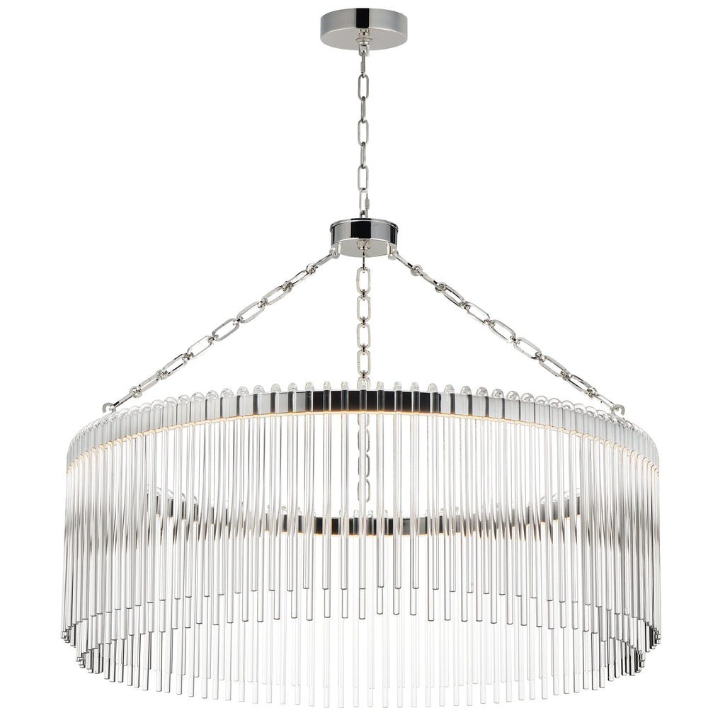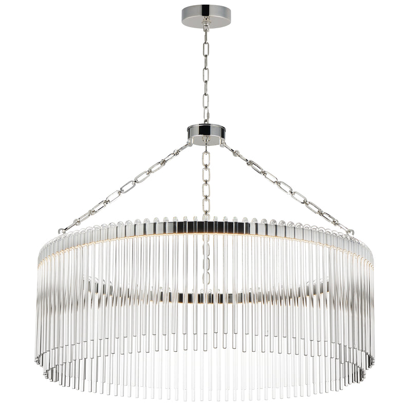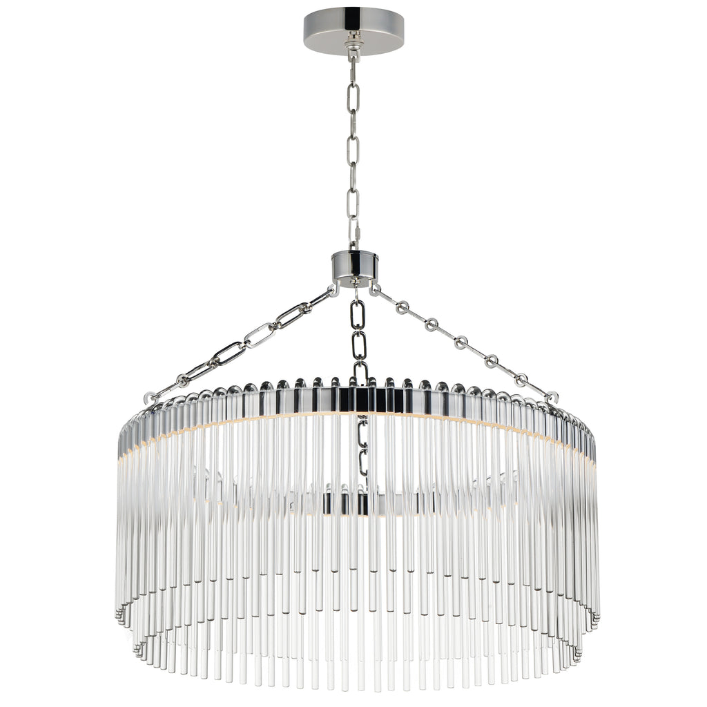 Clear glass rods elegantly curve to drape over a metal frame, encasing an integrated LED light source within. These ornamental glass rods form a luminous curtain, softly illuminated by the LEDs. The LED light source features an adjustable color temperature, allowing you to effortlessly switch between warm 2700K, neutral 3200K, and cool 4000K settings to suit any ambiance. Suspended by intricately designed chain links, the jewel-like glass skirt adds a touch of sophistication and refinement. Choose from two stunning frame finishes: Natural Aged Brass or Polished Nickel.