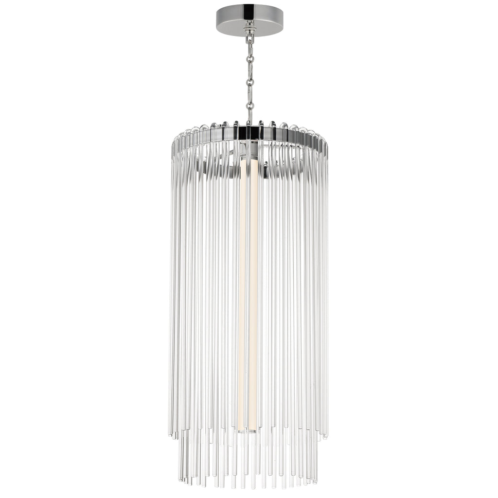 Clear glass rods elegantly curve to drape over a metal frame, encasing an integrated LED light source within. These ornamental glass rods form a luminous curtain, softly illuminated by the LEDs. The LED light source features an adjustable color temperature, allowing you to effortlessly switch between warm 2700K, neutral 3200K, and cool 4000K settings to suit any ambiance. Suspended by intricately designed chain links, the jewel-like glass skirt adds a touch of sophistication and refinement. Choose from two stunning frame finishes: Natural Aged Brass or Polished Nickel.