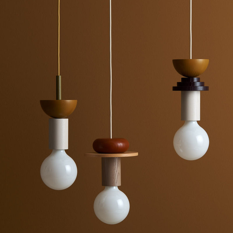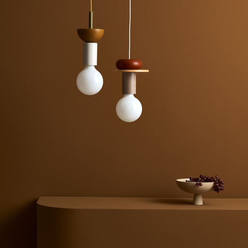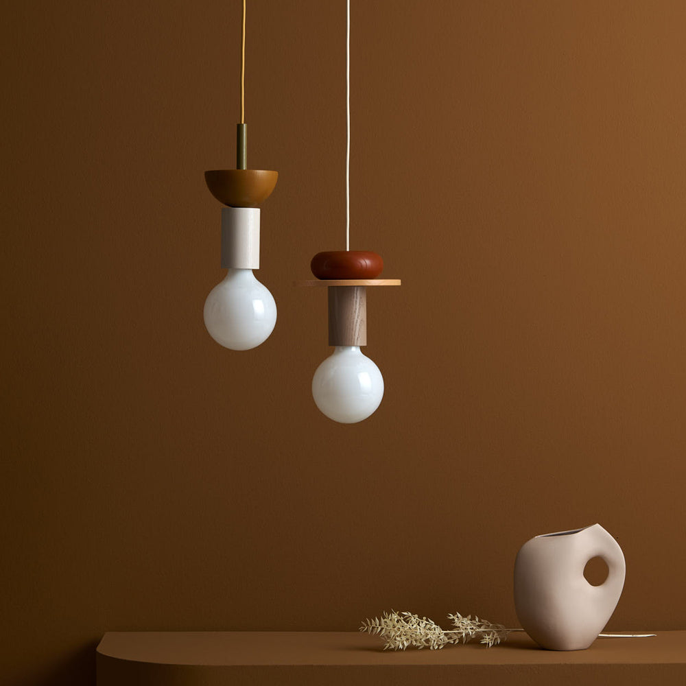 The "Pan" lighting consists of 3 elements: A socket with nougat colored finish, a peach colored piece and a dark rust colored element on top. The textile cable color is cream.