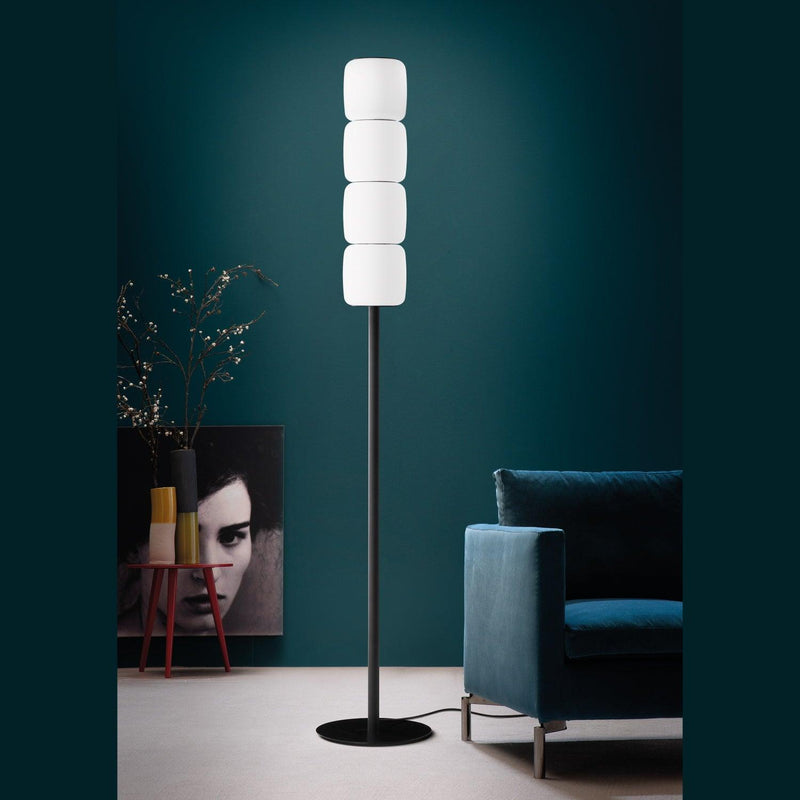 Series of lamps in acid-etched white blown glass. Metallic structures in matte black. remove dimmable according to bulb.