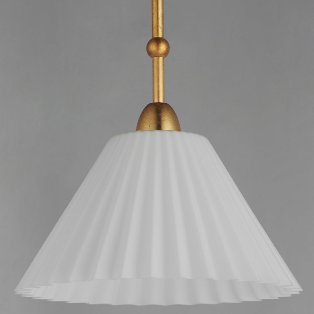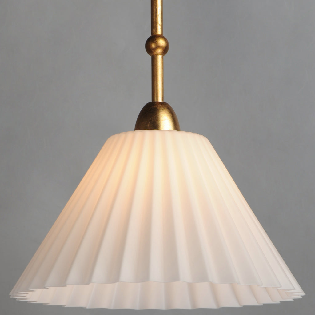 Touches of biophilic details and charming Satin White glass shades modeled on pleated fabric shades create elegant and approachable lighting fixtures. Finished in a rich hand-applied gold leaf, the elongated frame of the chandelier and upturned sconce takes on unique proportions. This collection was designed in collaboration with the eponymous design duo, Kismet House, whose style is embodied in the nostalgic details represented in the shapes, finishes, and overall concept.