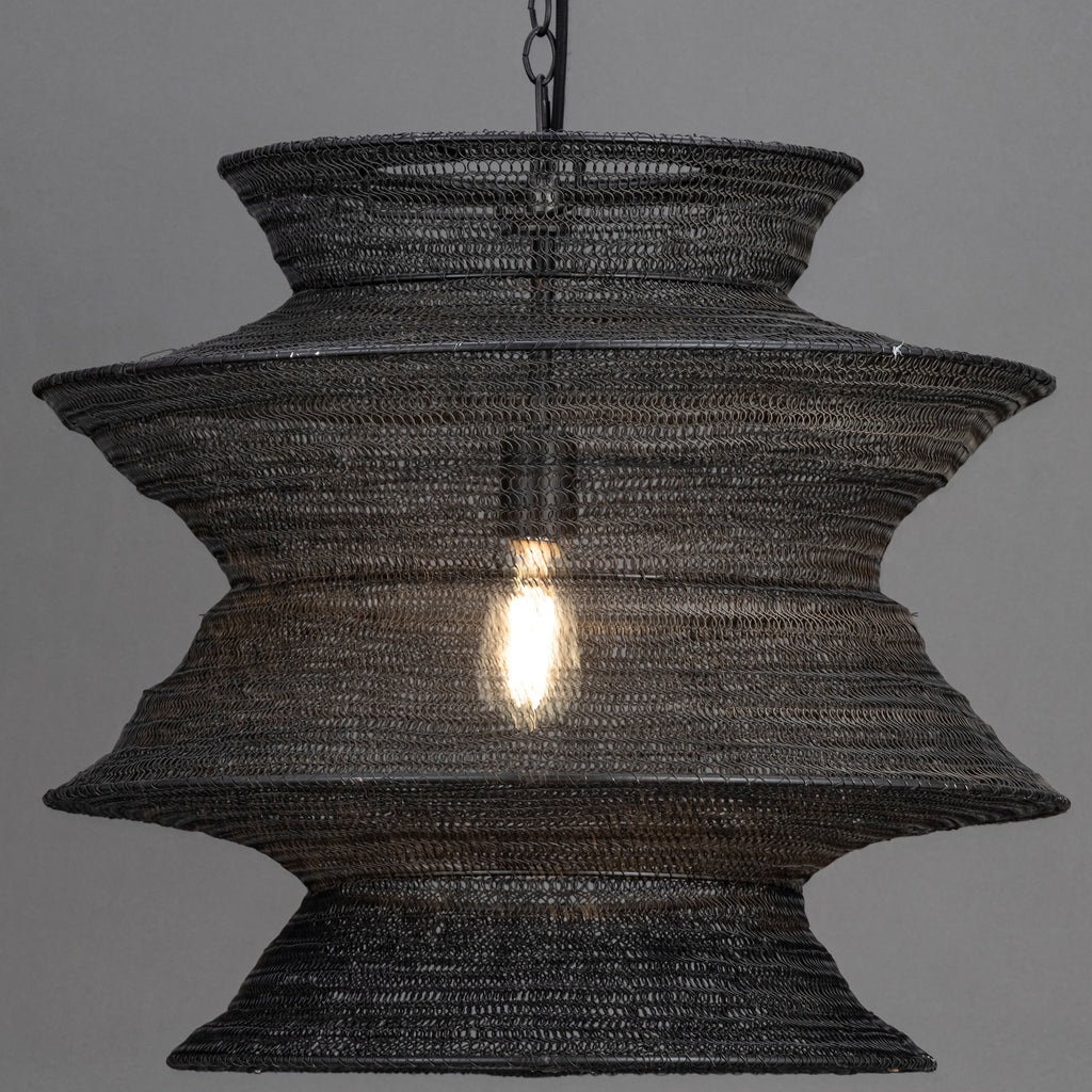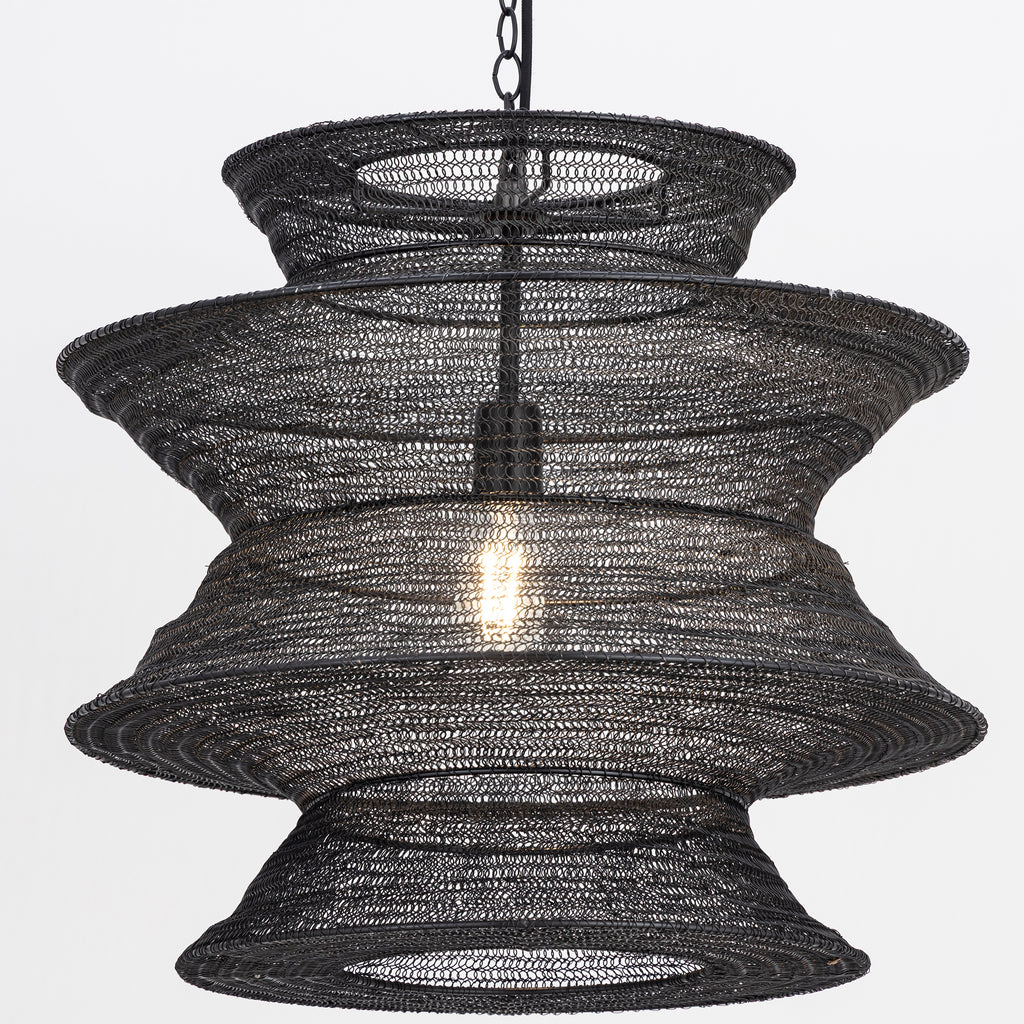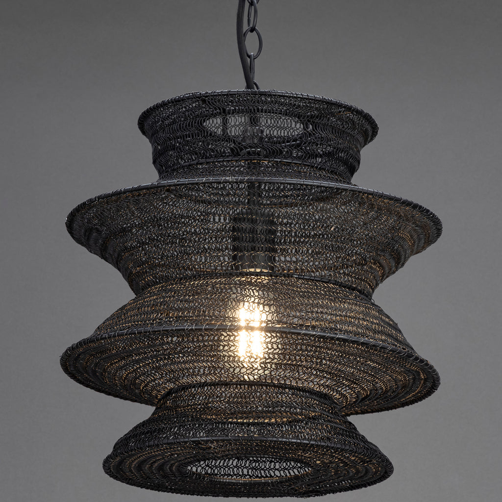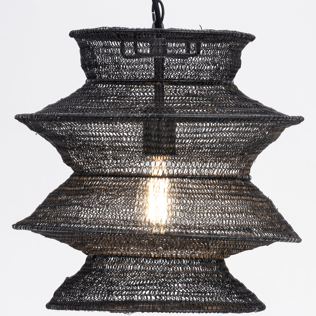Airy yet impactful, Krabi brings sculptural movement and moody ambiance to any interior. Layers of black metal mesh form undulating rings that seem to float in place, tapering and expanding like a lantern in motion. When illuminated, the open-weave shade creates a dynamic play of light and shadow, casting intricate patterns across surrounding surfaces. Suspended from a simple chain, Krabi offers a dramatic silhouette with an unexpectedly delicate presence-perfect for powder rooms, bedrooms, or anywhere that calls for texture with a twist.