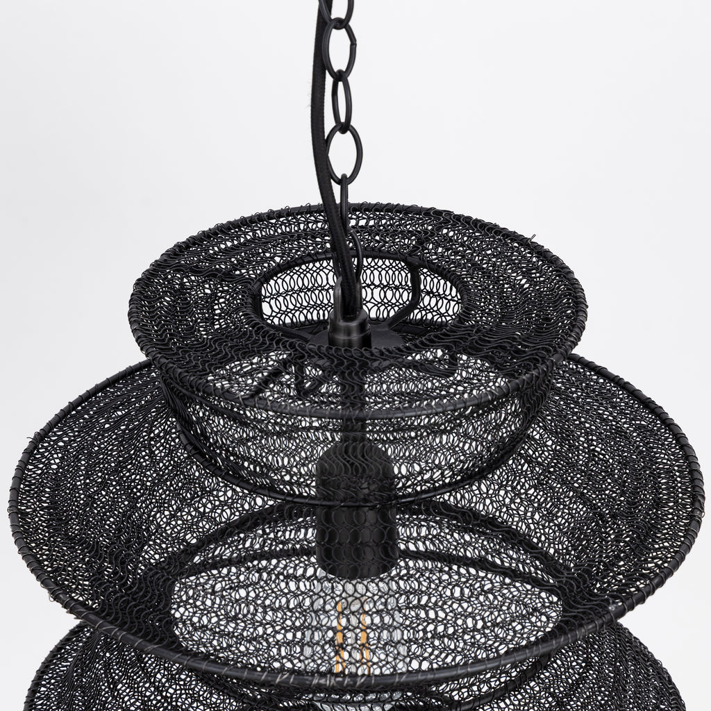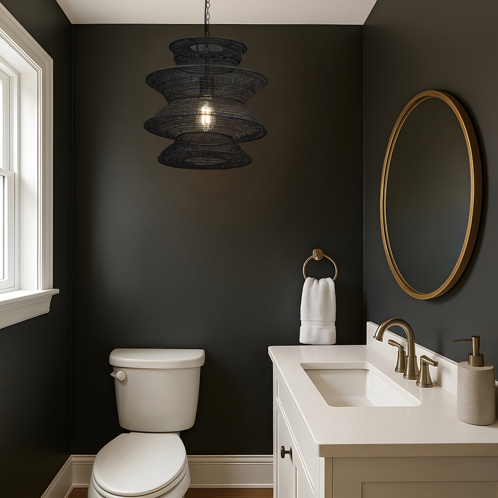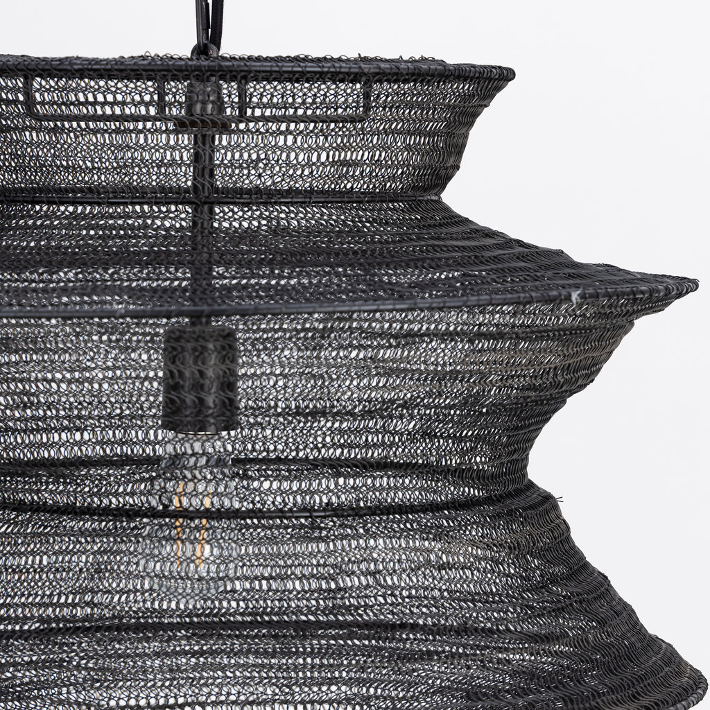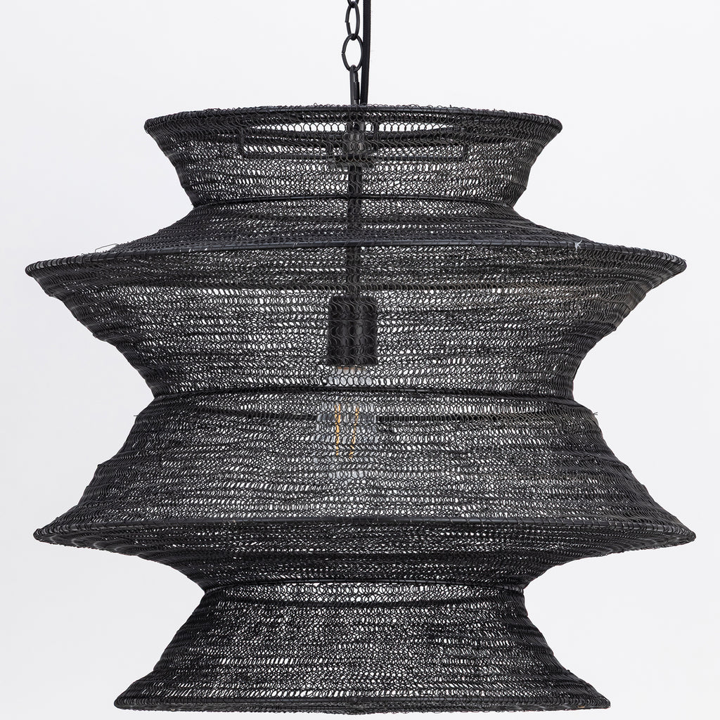 Airy yet impactful, Krabi brings sculptural movement and moody ambiance to any interior. Layers of black metal mesh form undulating rings that seem to float in place, tapering and expanding like a lantern in motion. When illuminated, the open-weave shade creates a dynamic play of light and shadow, casting intricate patterns across surrounding surfaces. Suspended from a simple chain, Krabi offers a dramatic silhouette with an unexpectedly delicate presence-perfect for powder rooms, bedrooms, or anywhere that calls for texture with a twist.